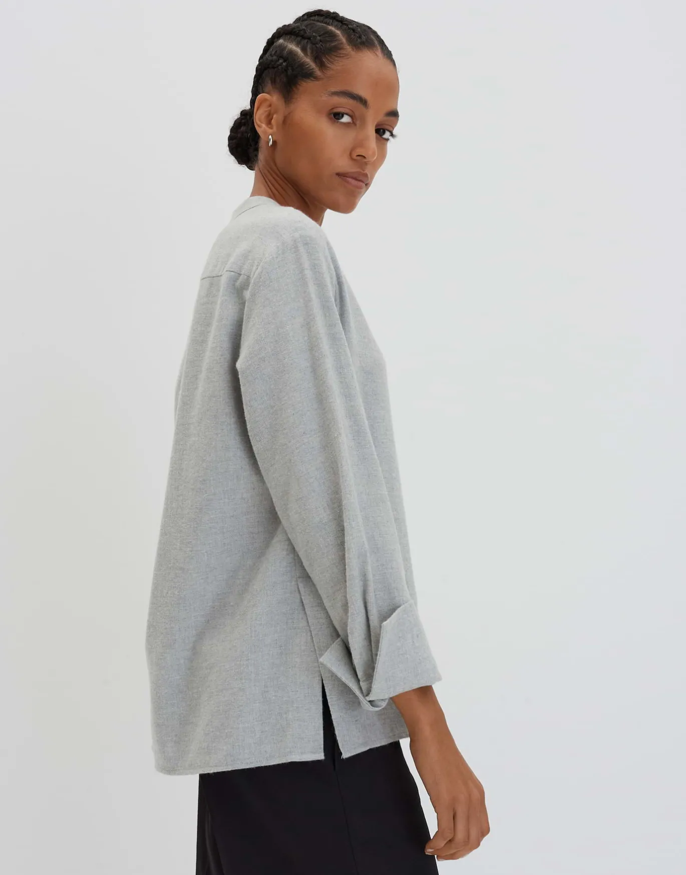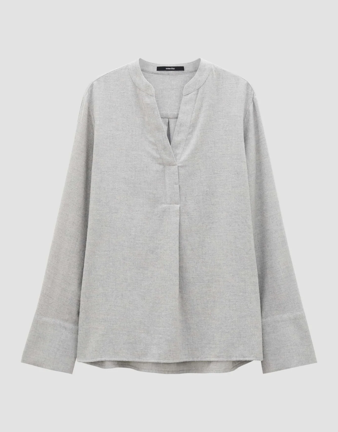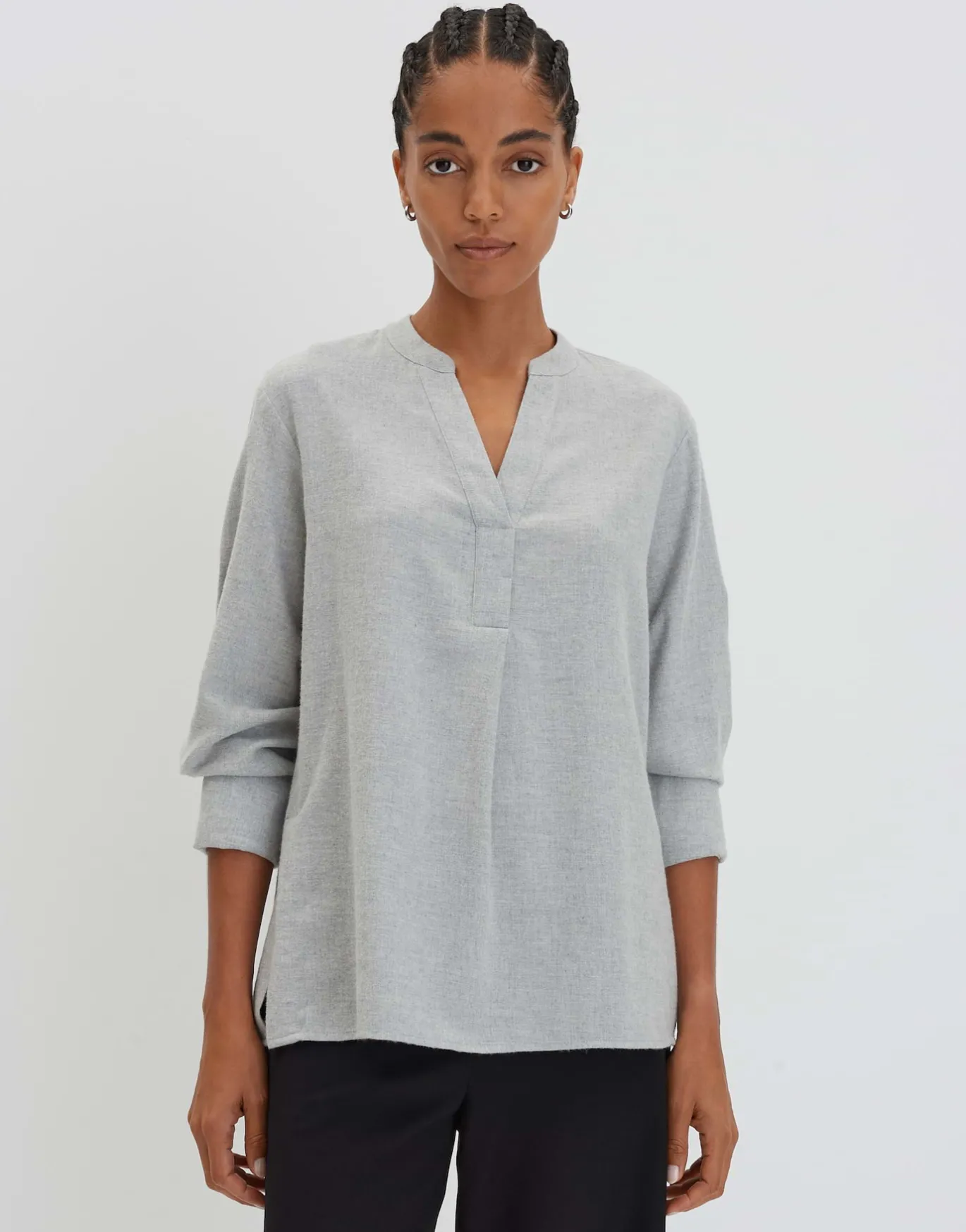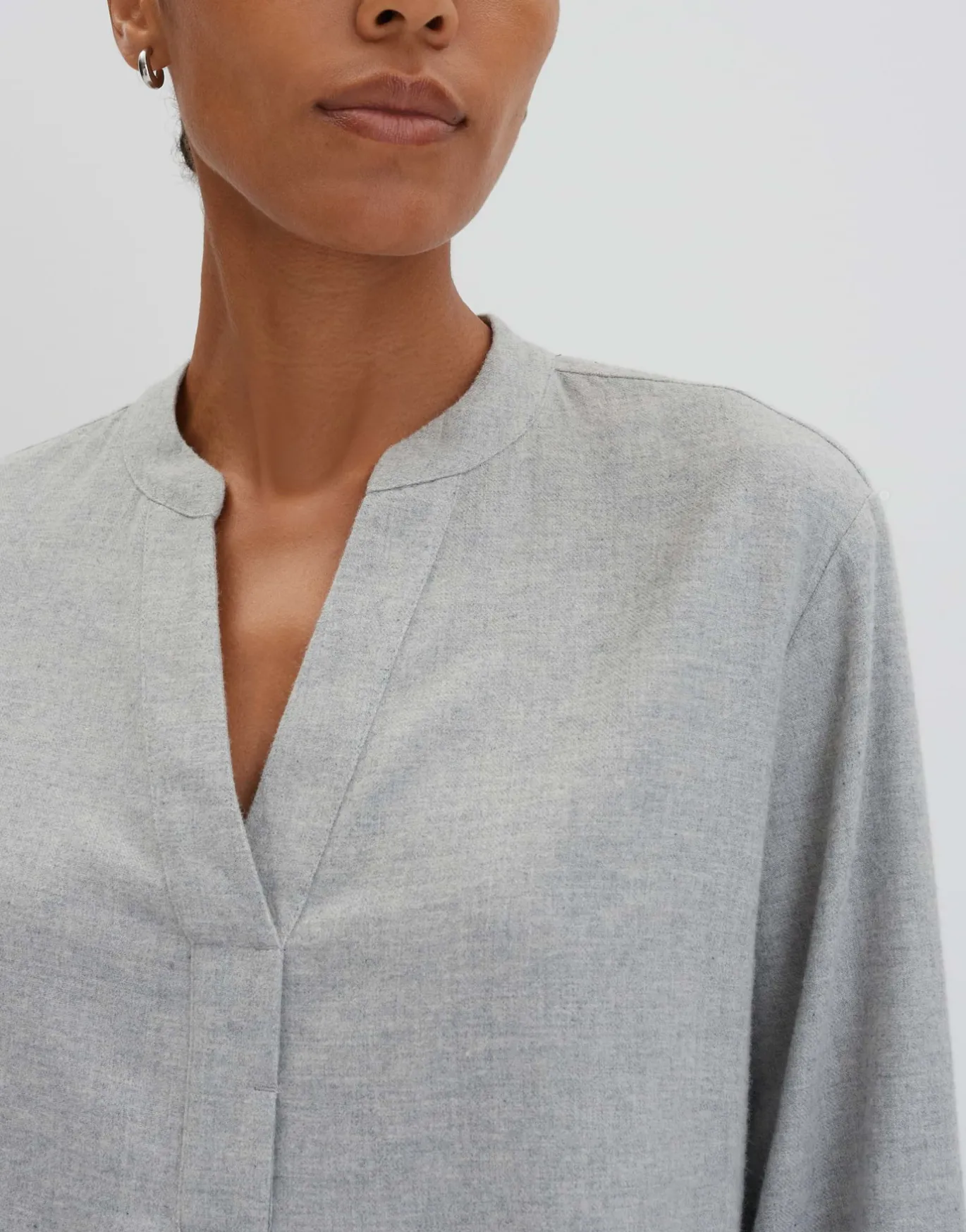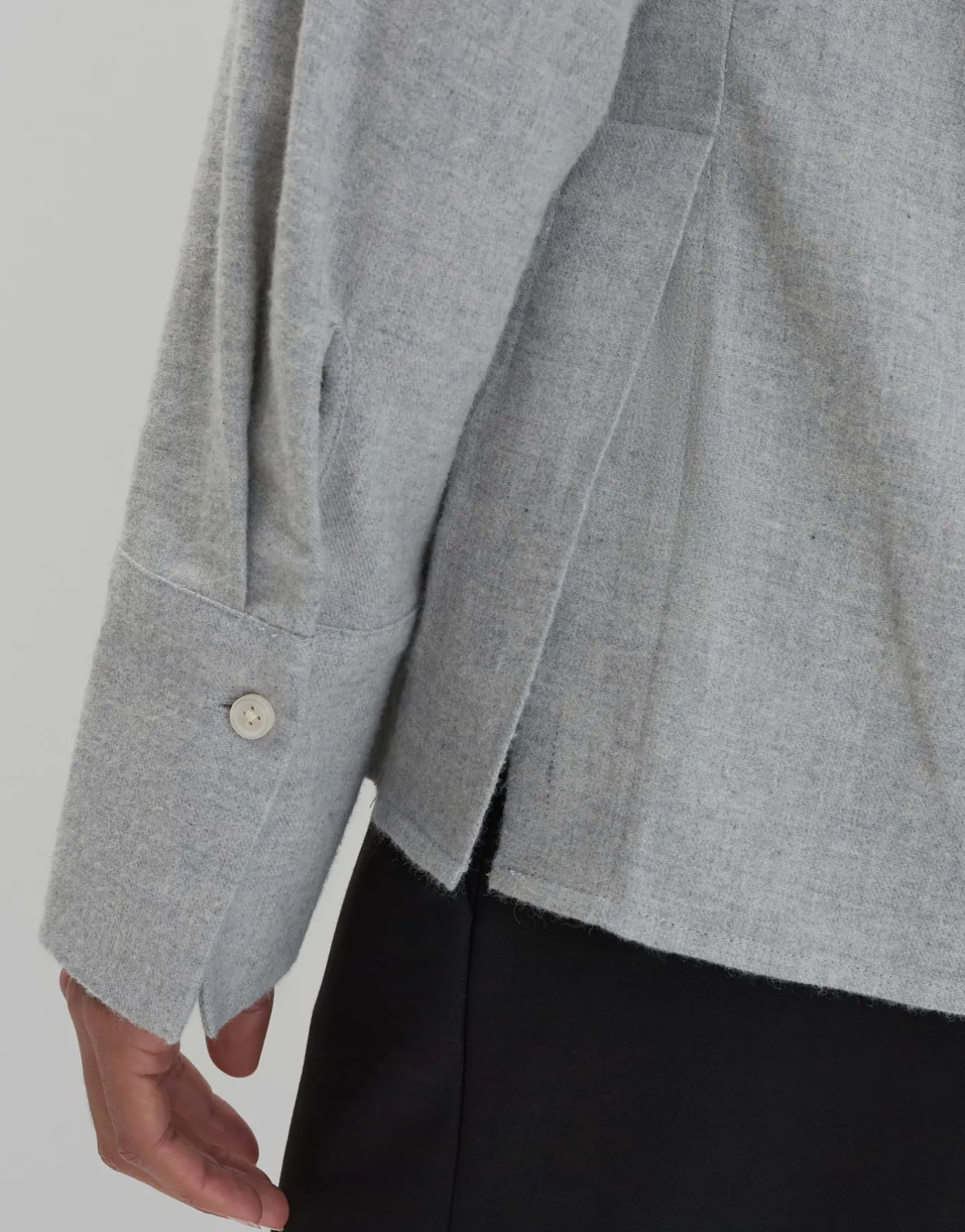 Die Flanellbluse setzt auf feminine, elegante Details und setzt einen spannenden Kontrast mit dem flanelligen Stoff.