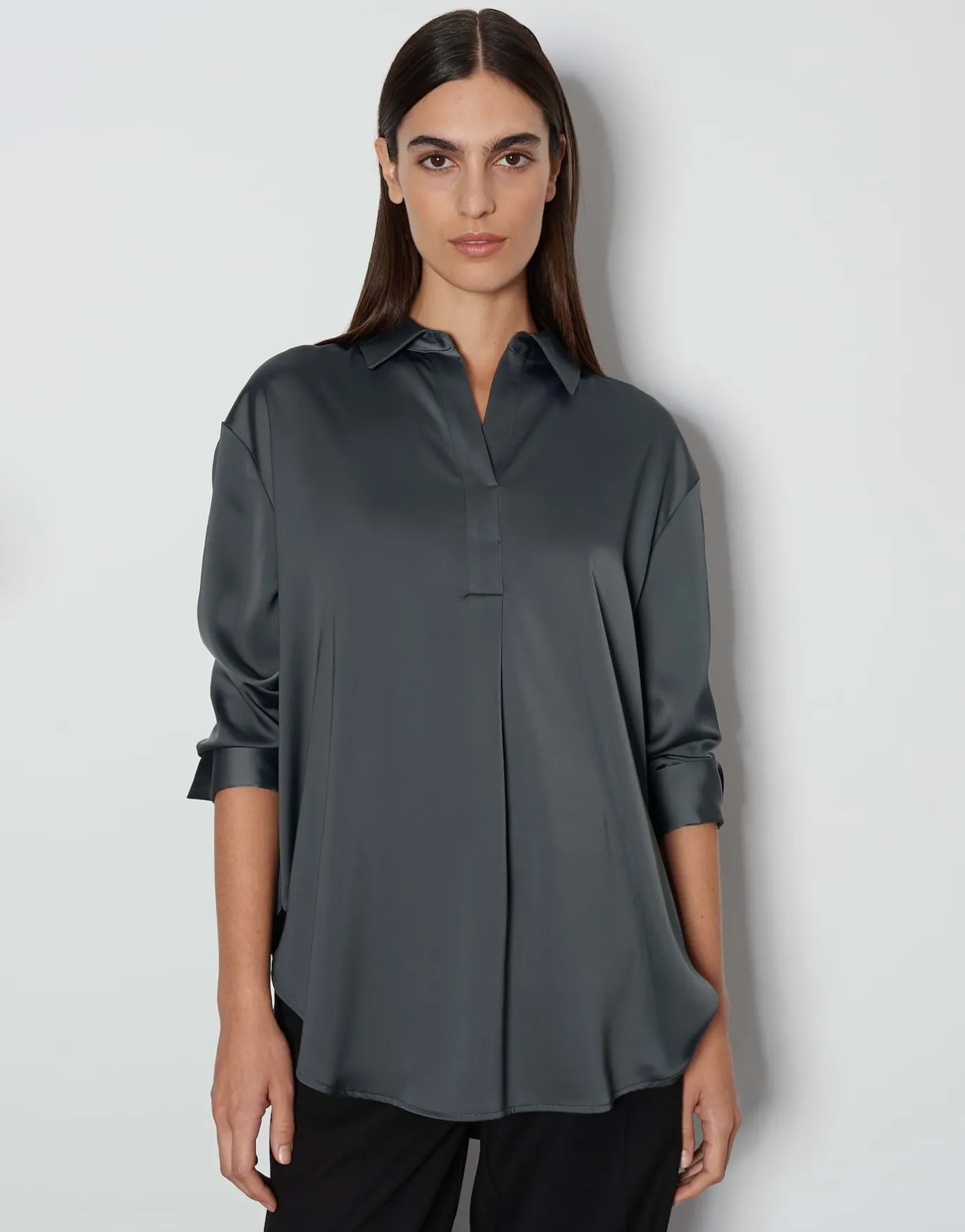 Die Shirtbluse aus einem Recycled Polyester Mix ist ein echtes Christmas Basic. Die schwere, glänzende Ware wirkt besonders hochwertig und edel. Der sportive Polokragen läuft in einen V-Neck über.