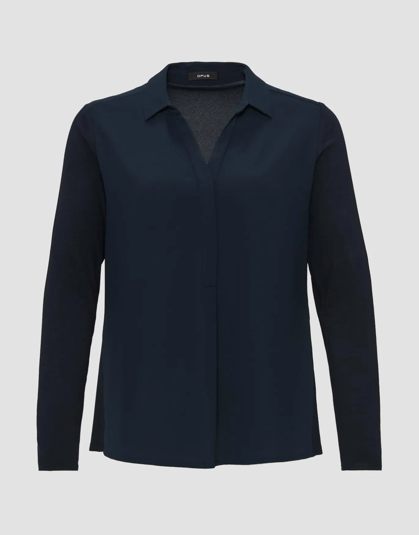 Die Shirtbluse ist aus einem harmonischen Material Mix gefertigt und ein easy Basic für jeden Tag. Der klassische Polokragen läuft in einen femininen V-Ausschnitt aus. Die Front und Passe aus einer fließenden Blusenware bricht mit dem Rücken und den Ärmeln aus einem soften Jersey Mix.