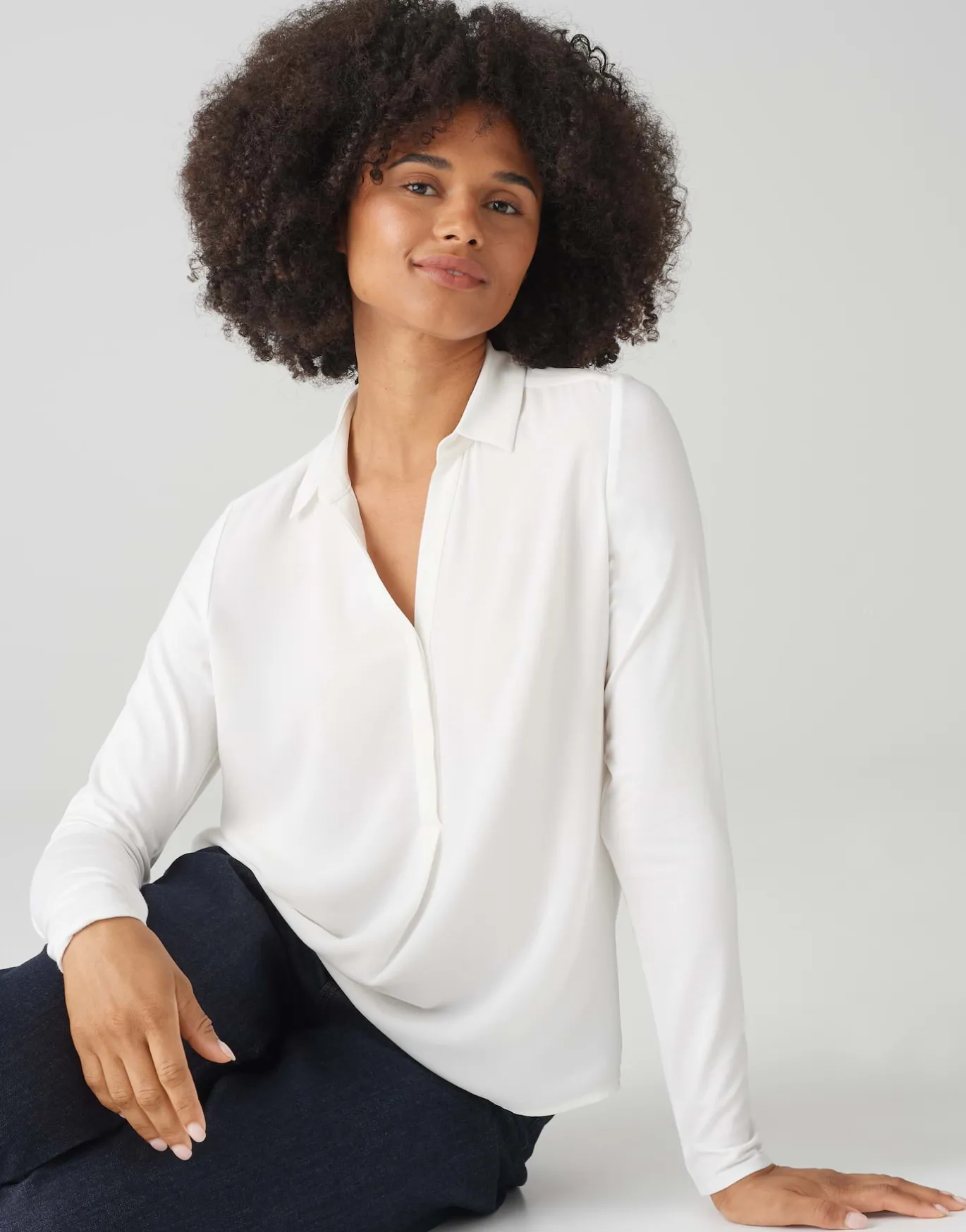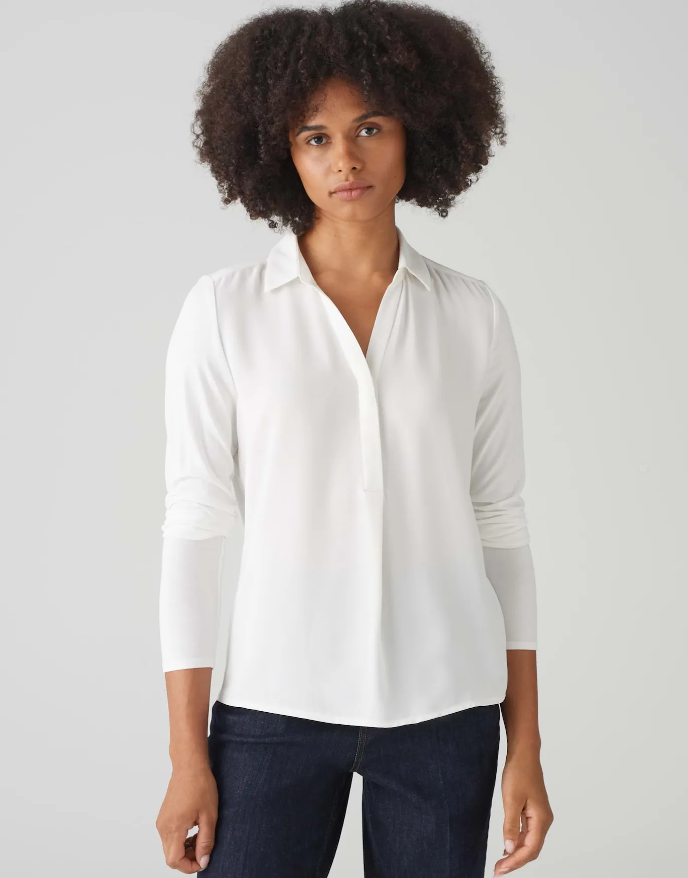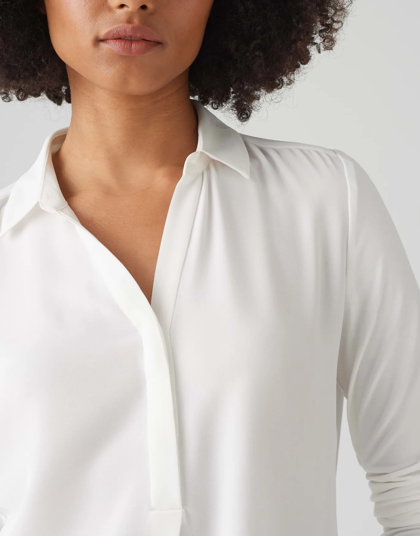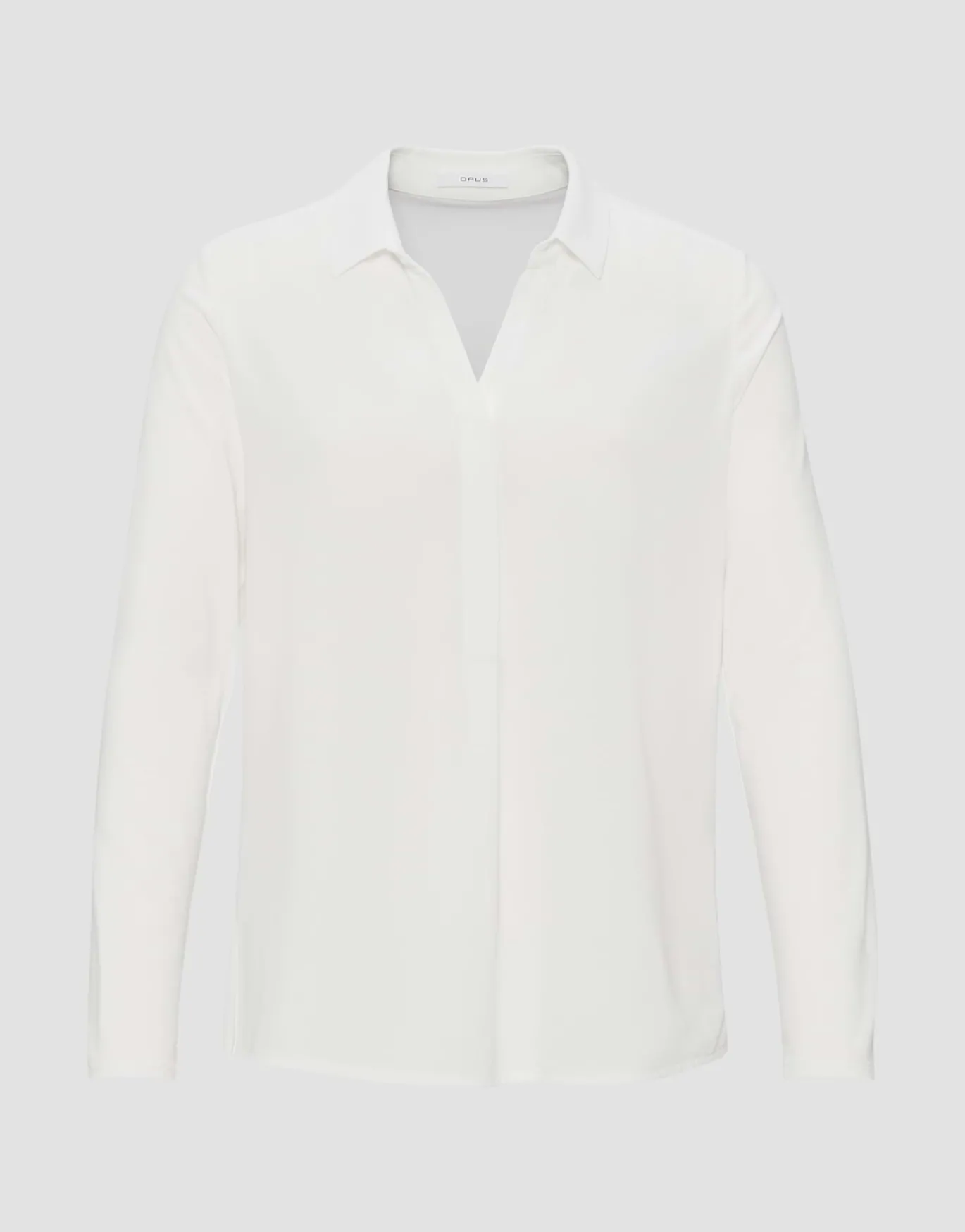 Die Shirtbluse ist aus einem harmonischen Material Mix gefertigt und ein easy Basic für jeden Tag. Der klassische Polokragen läuft in einen femininen V-Ausschnitt aus. Die Front und Passe aus einer fließenden Blusenware bricht mit dem Rücken und den Ärmeln aus einem soften Jersey Mix.