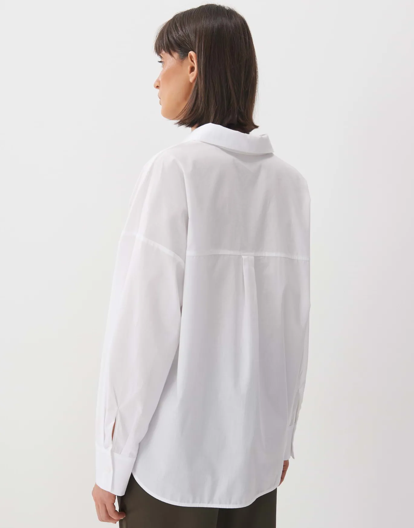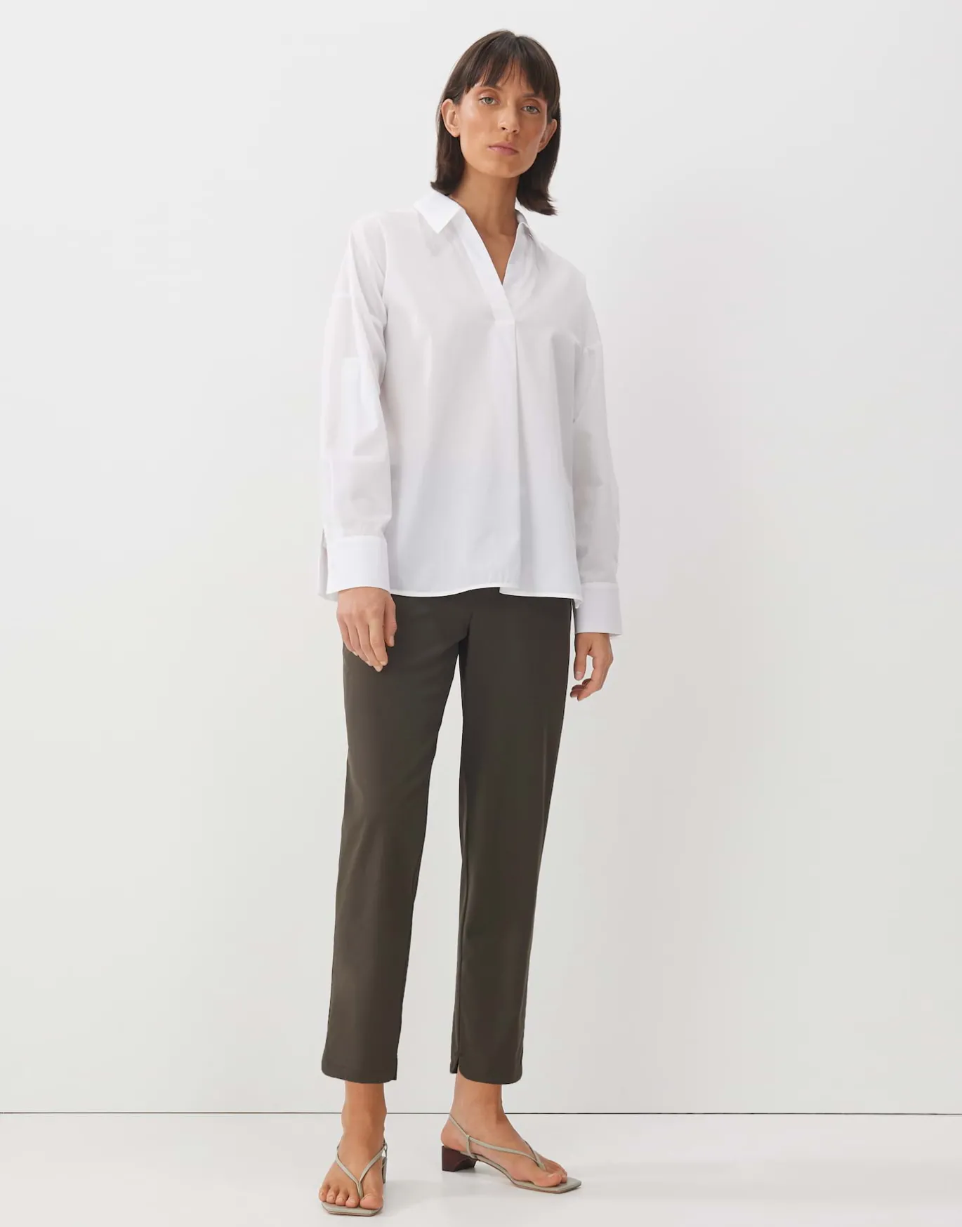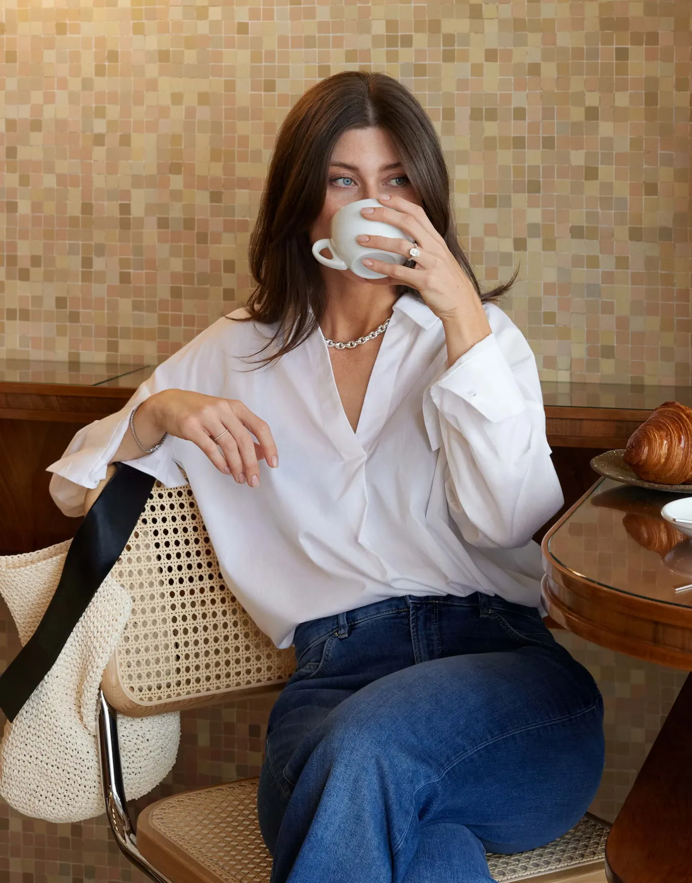 Die Tunikabluse kann mit ihrer Oversizer Passform klassisch als Bluse oder als Jacken-Ersatz getragen werden.