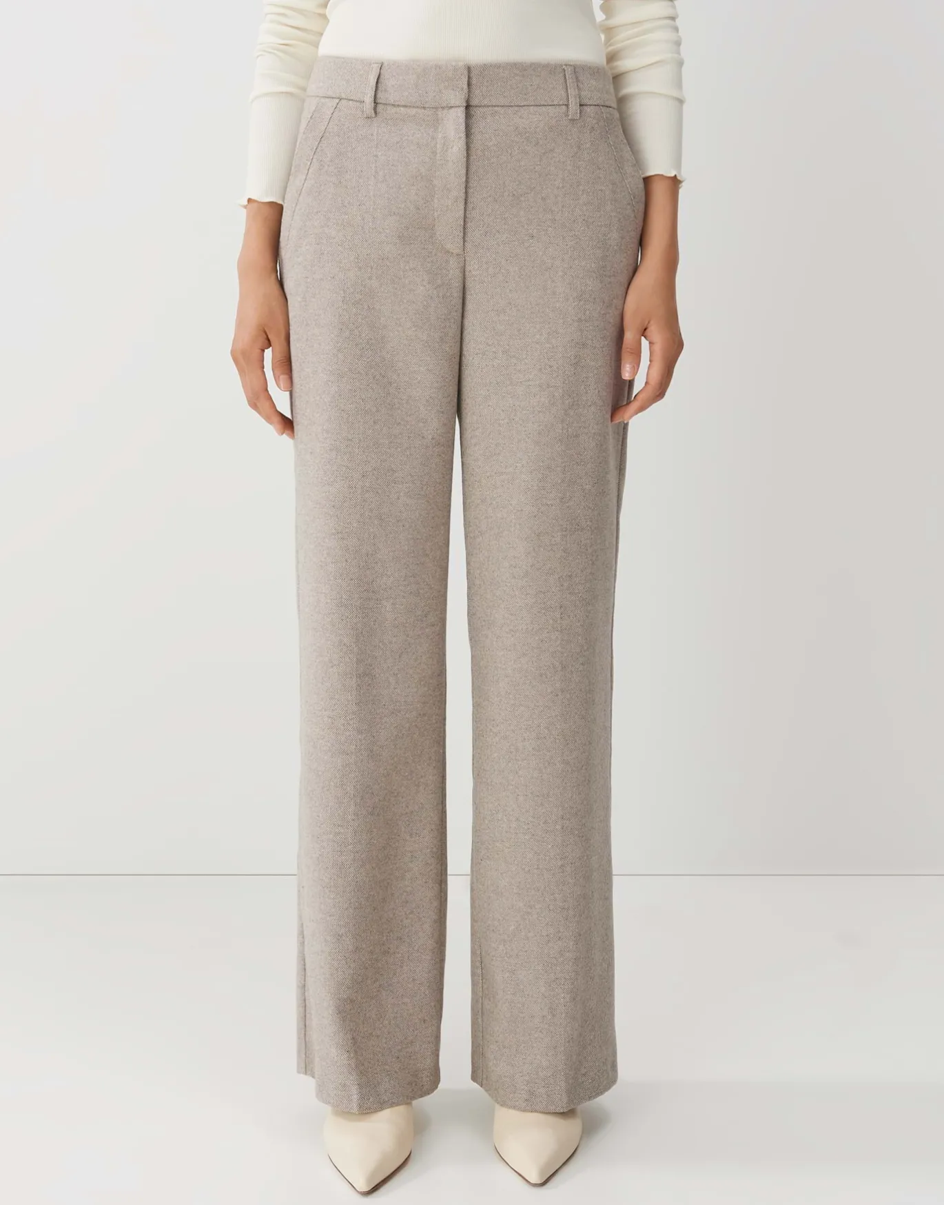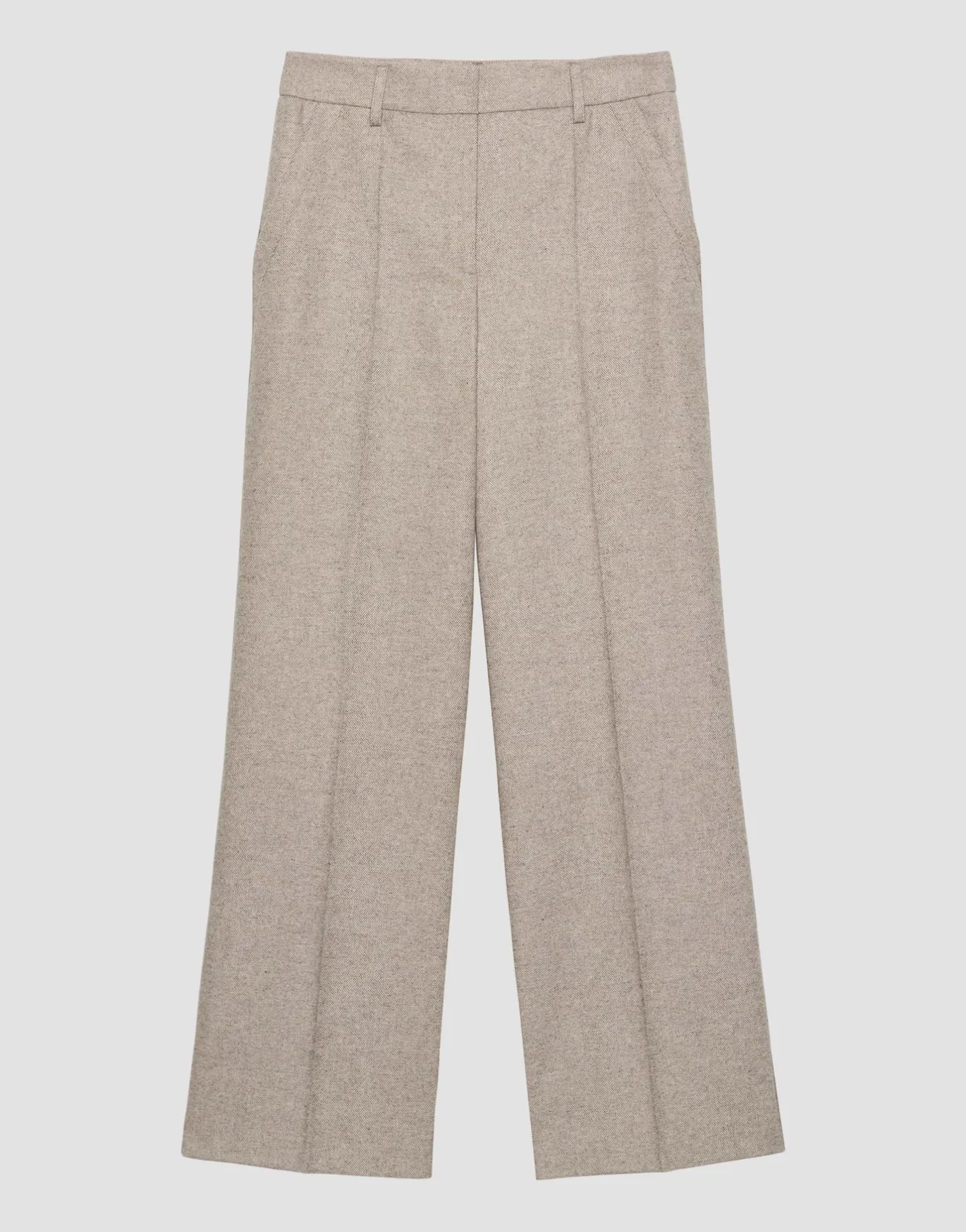 Die Anzughose aus einem weichen Woll-Mix spielt eine klassische Salz-Pfeffer-Optik über einen geraden, langen Beinverla…