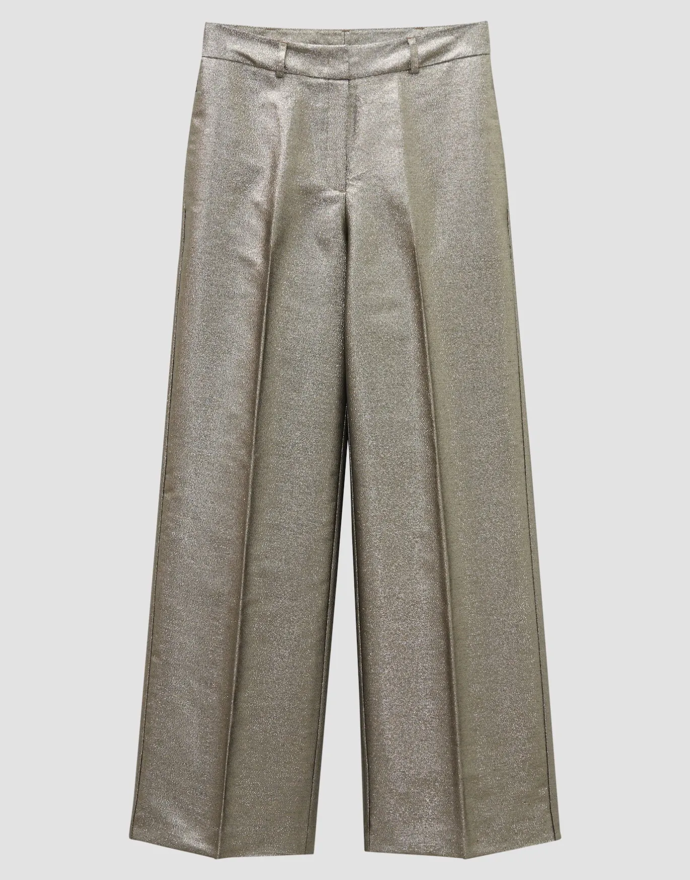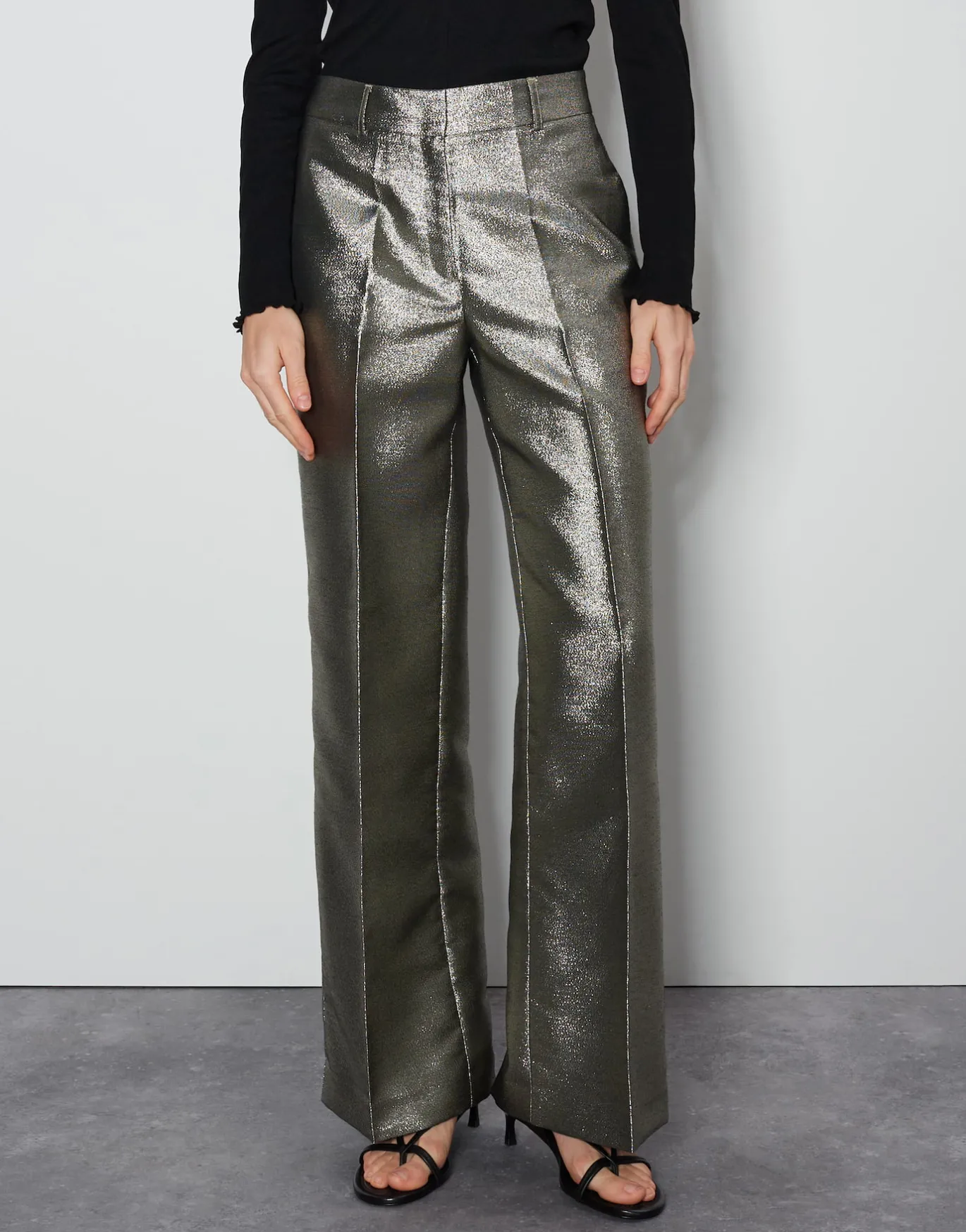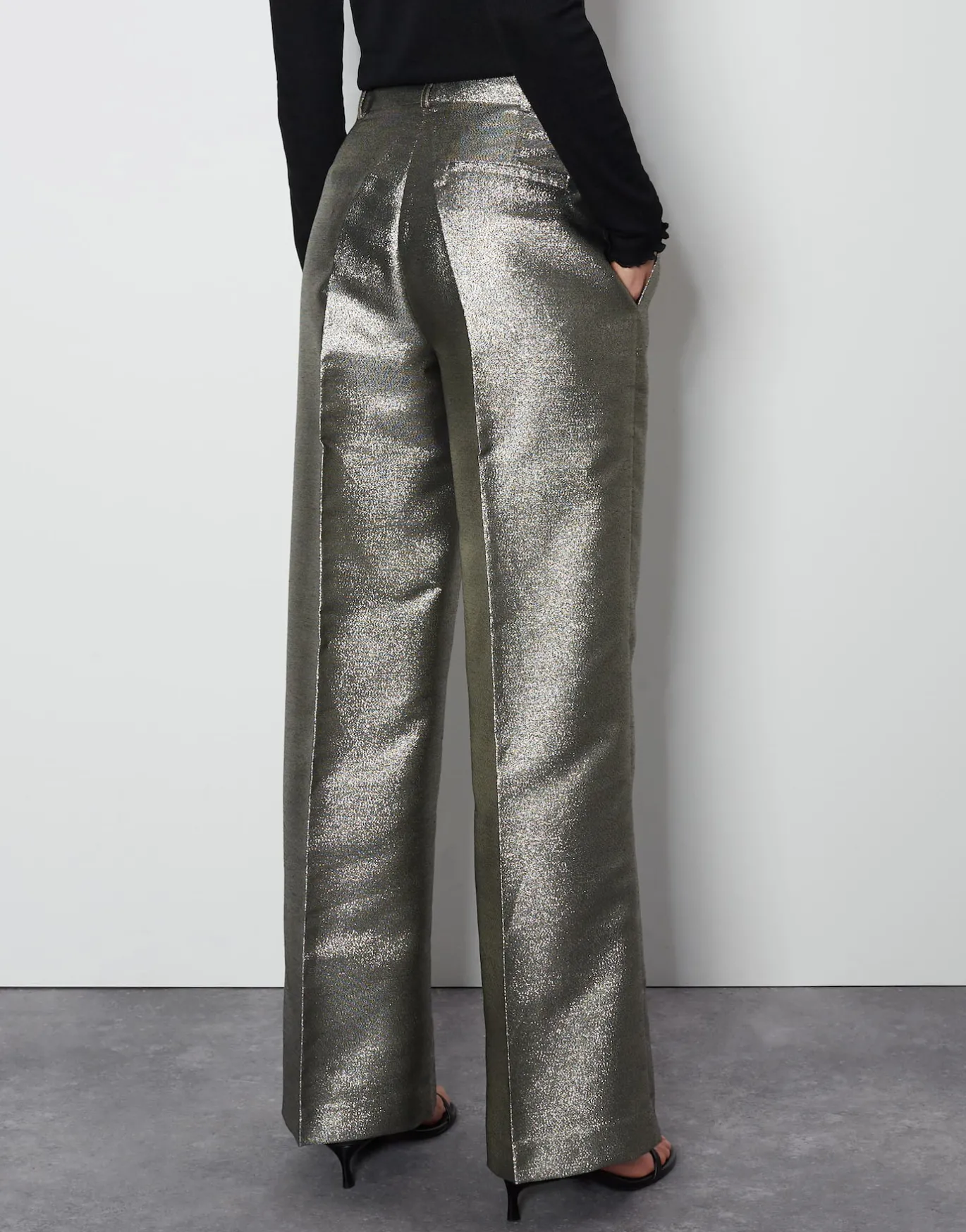 Die Anzughose mit weitem, langen Bein setzt nicht nur auf elegante Details, sondern auch einen anmutig schimmernden Stoff – perfekt für besondere Anlässe.