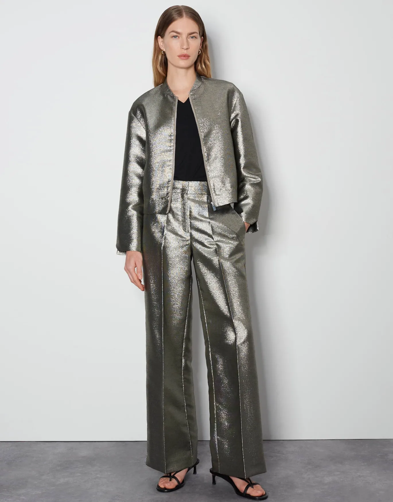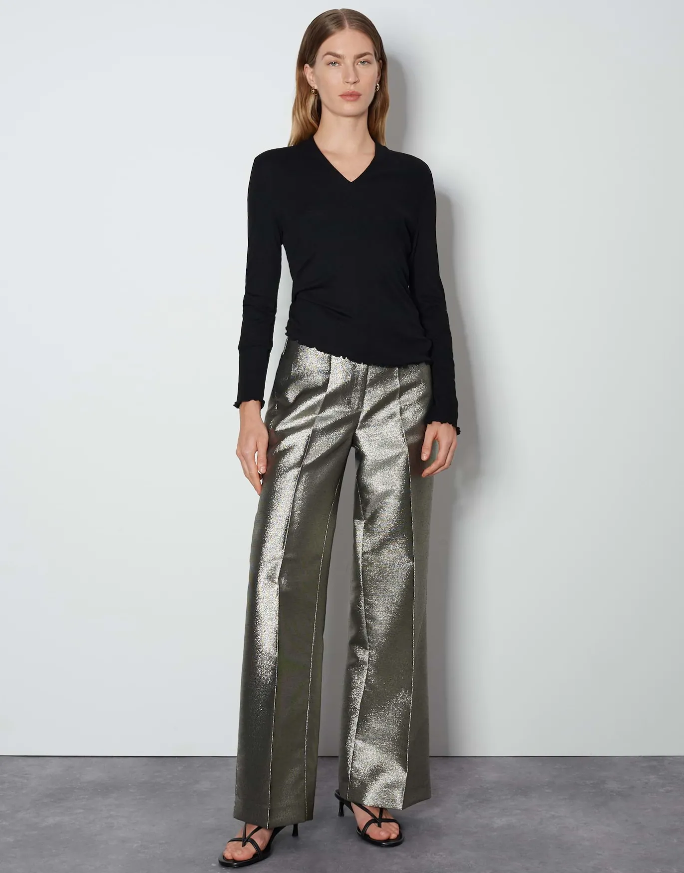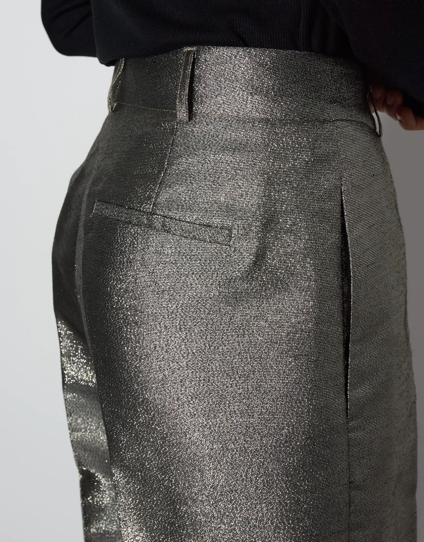 Die Anzughose mit weitem, langen Bein setzt nicht nur auf elegante Details, sondern auch einen anmutig schimmernden Stoff – perfekt für besondere Anlässe.