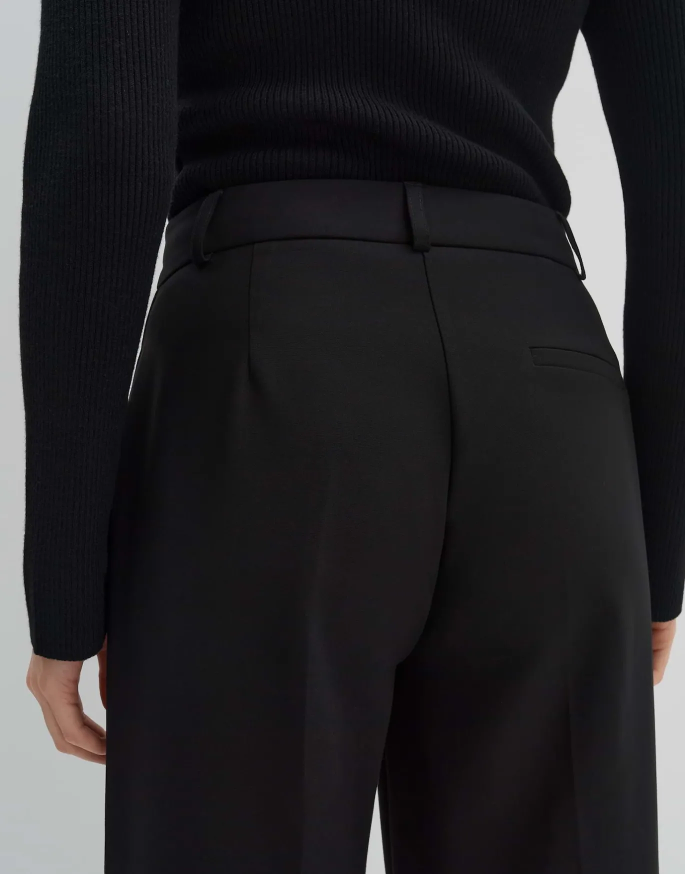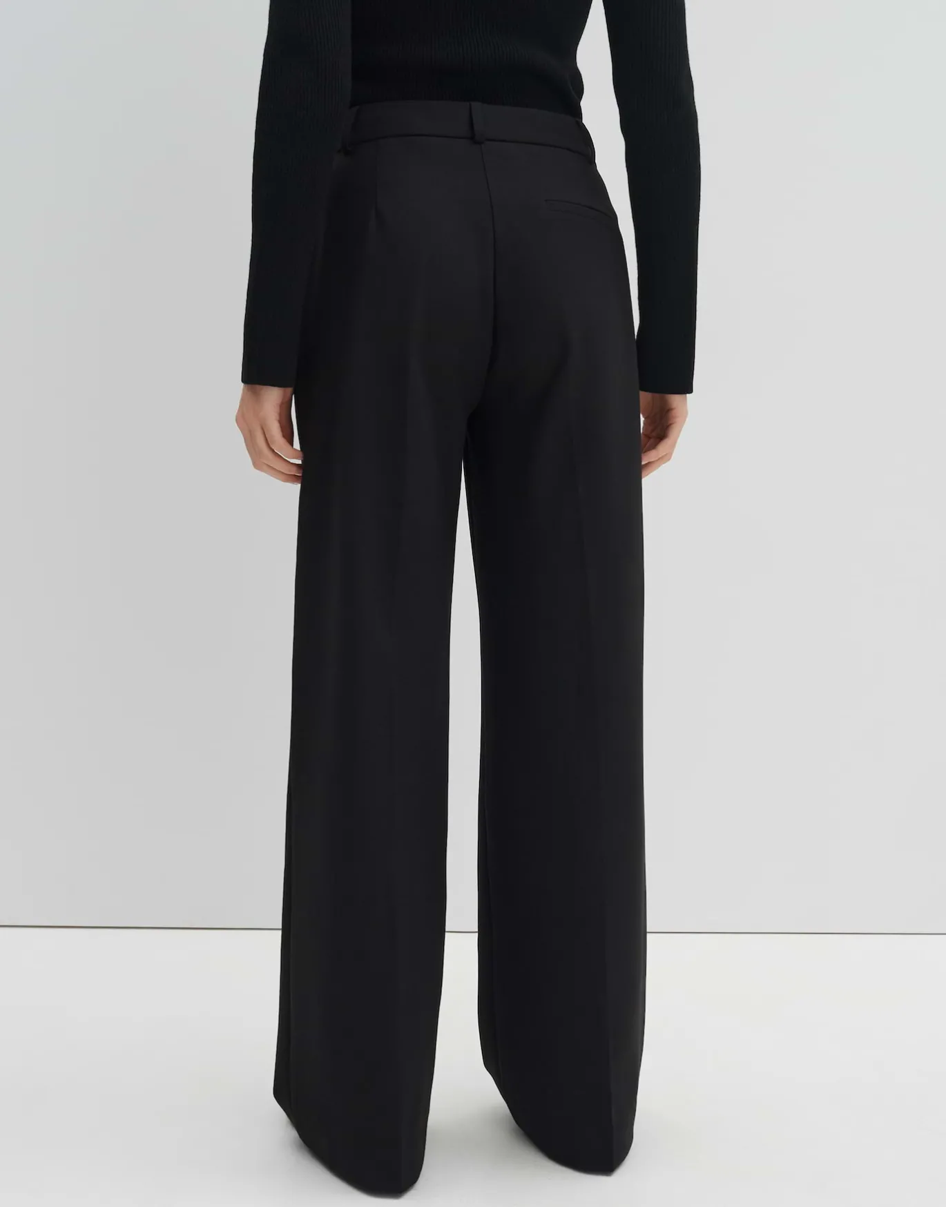 Die klassische Stoffhose setzt mit dem weiten, geraden Bein auf einen eleganten Look.