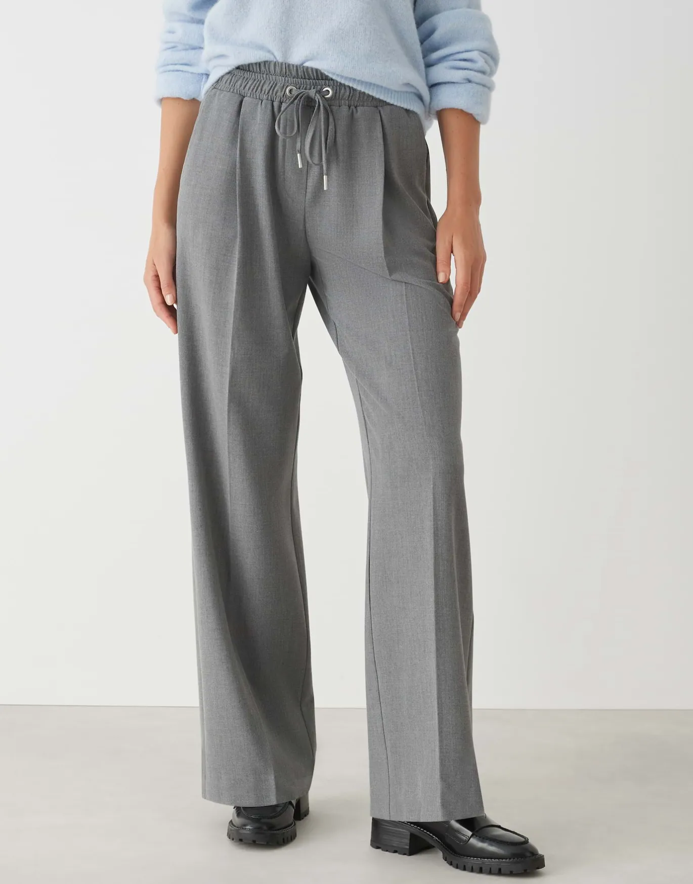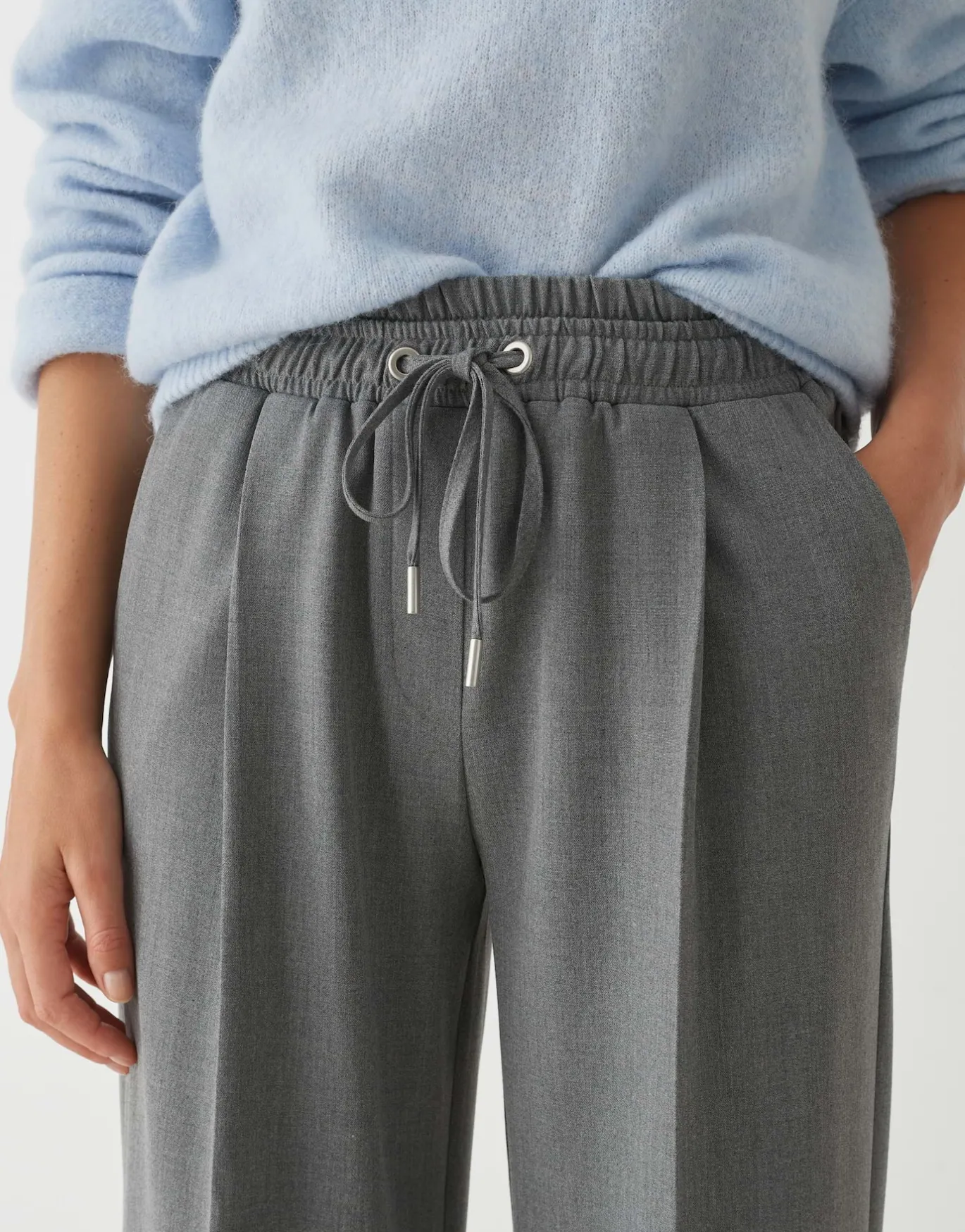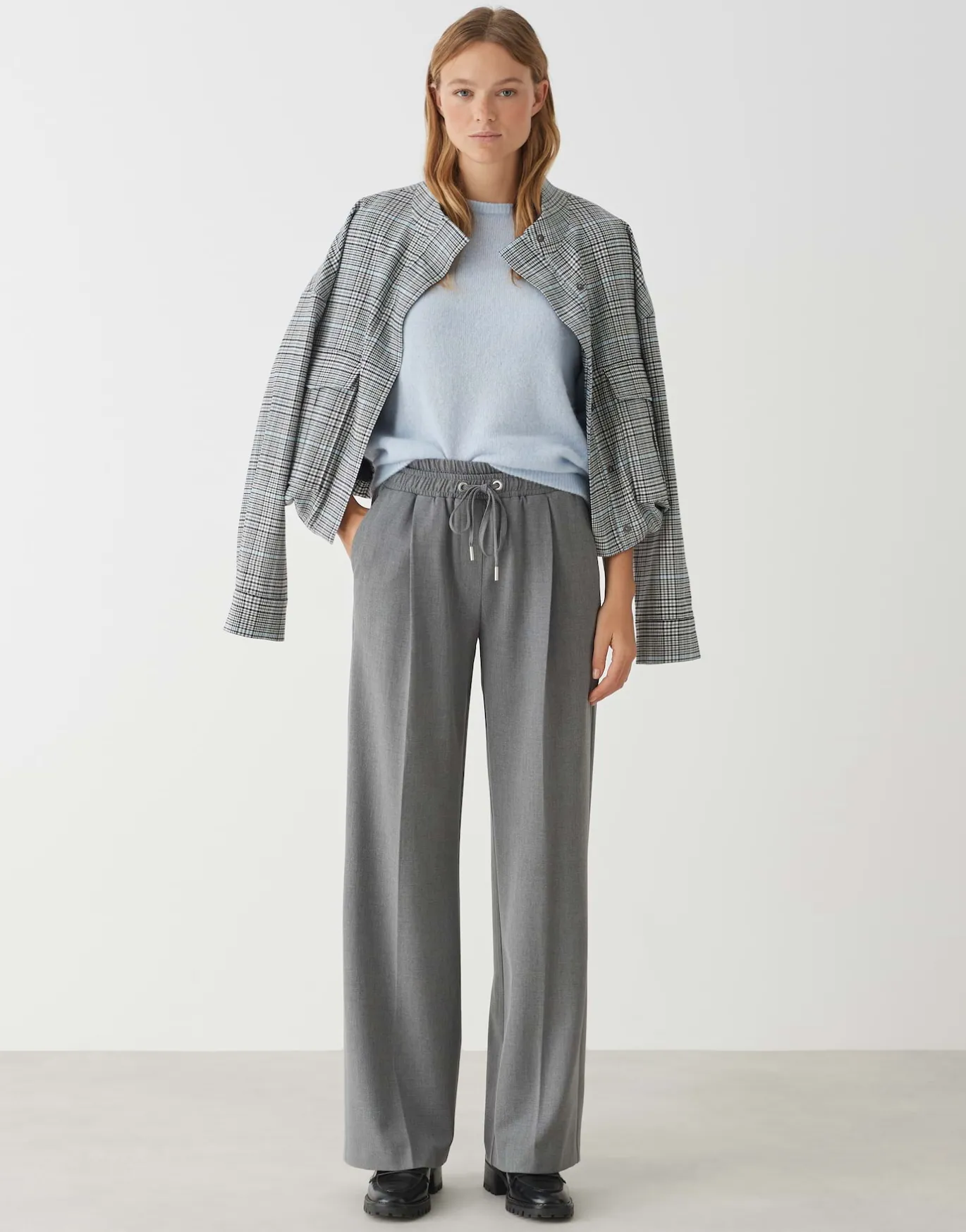 Die weite Bundfaltenhose setzt durch den doppelten, gesmokten Gummibund auf maximalen Tragekomfort und erleichtert das Einsteigen – für einen unkomplizierten Office Look.