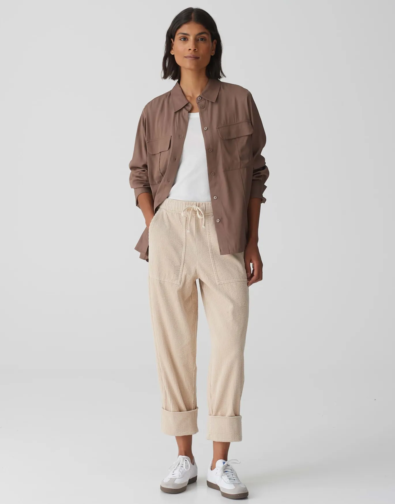 Die Cordhose ist in lässiger Jogger Silhouette mit einer soften Oberfläche gefertigt. Das verkürzte Bein ist mit einem Umschlag versehen, der individuell in der Breite variiert werden kann.