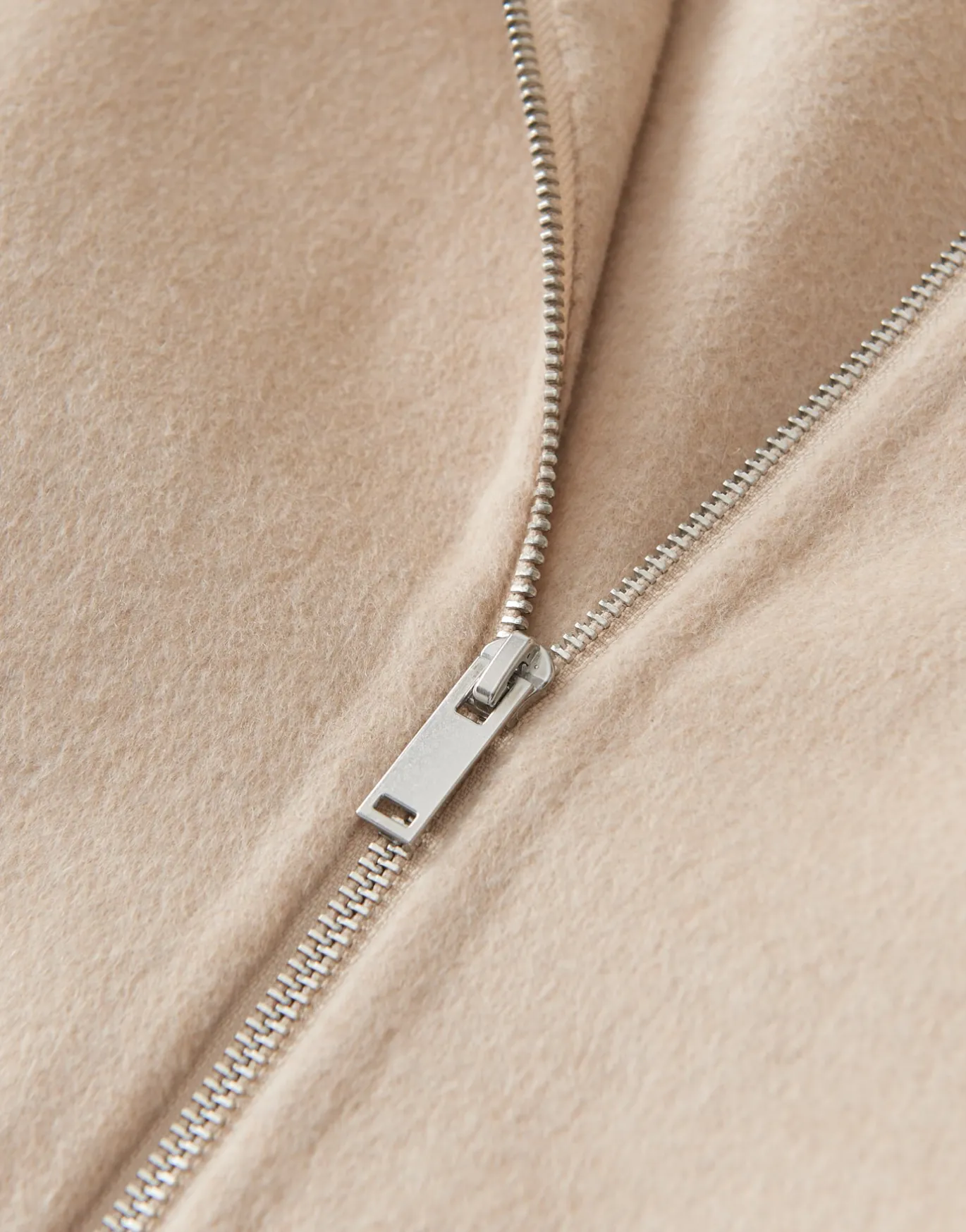 Die Wolljacke spielt ein raffiniertes Detail im Rücken und lässt sich durch die angenehme Qualität super transseasonal stylen.