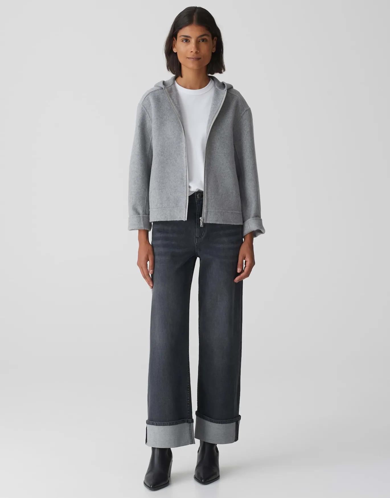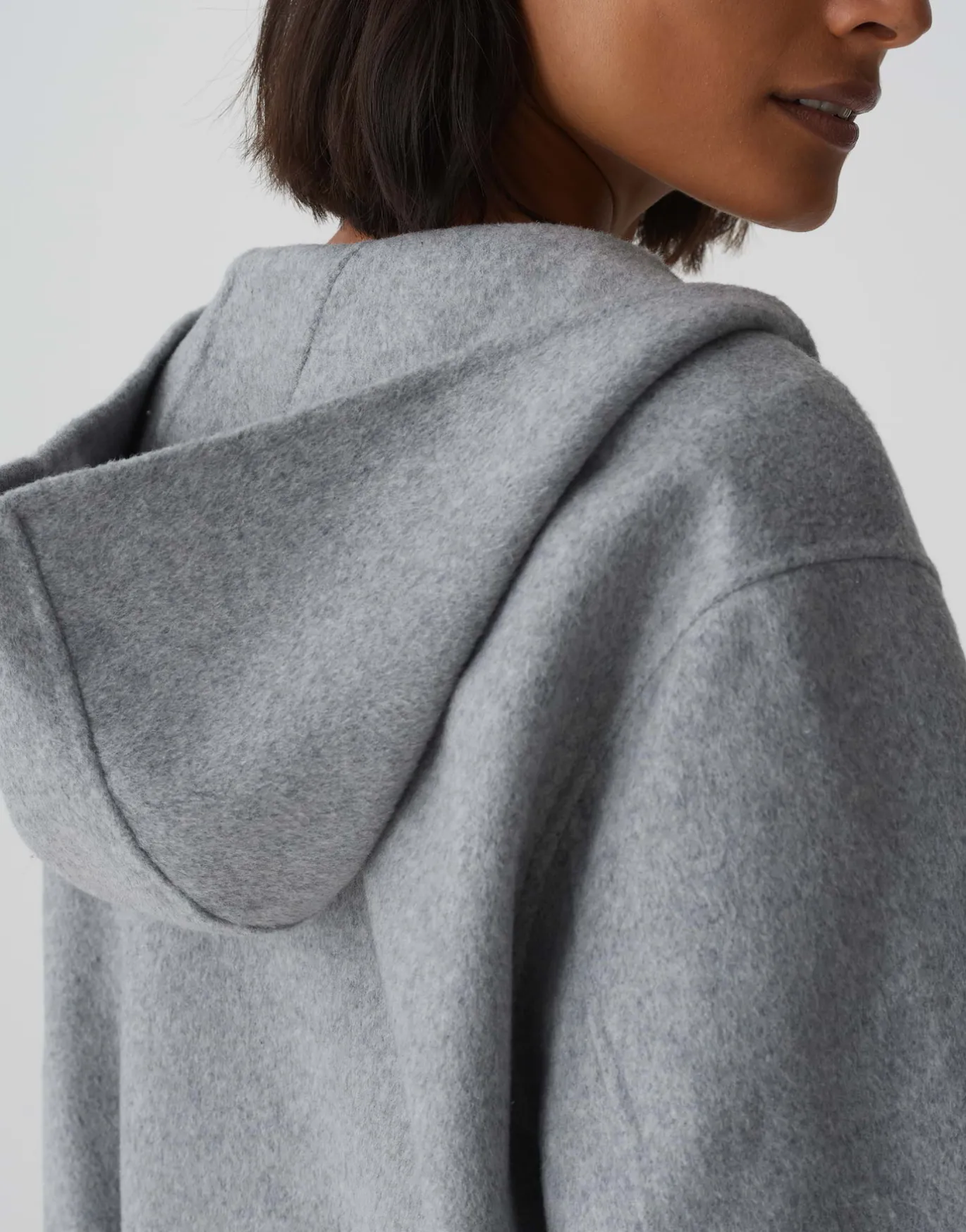 Die Wolljacke spielt ein raffiniertes Detail im Rücken und lässt sich durch die angenehme Qualität super transseasonal stylen.