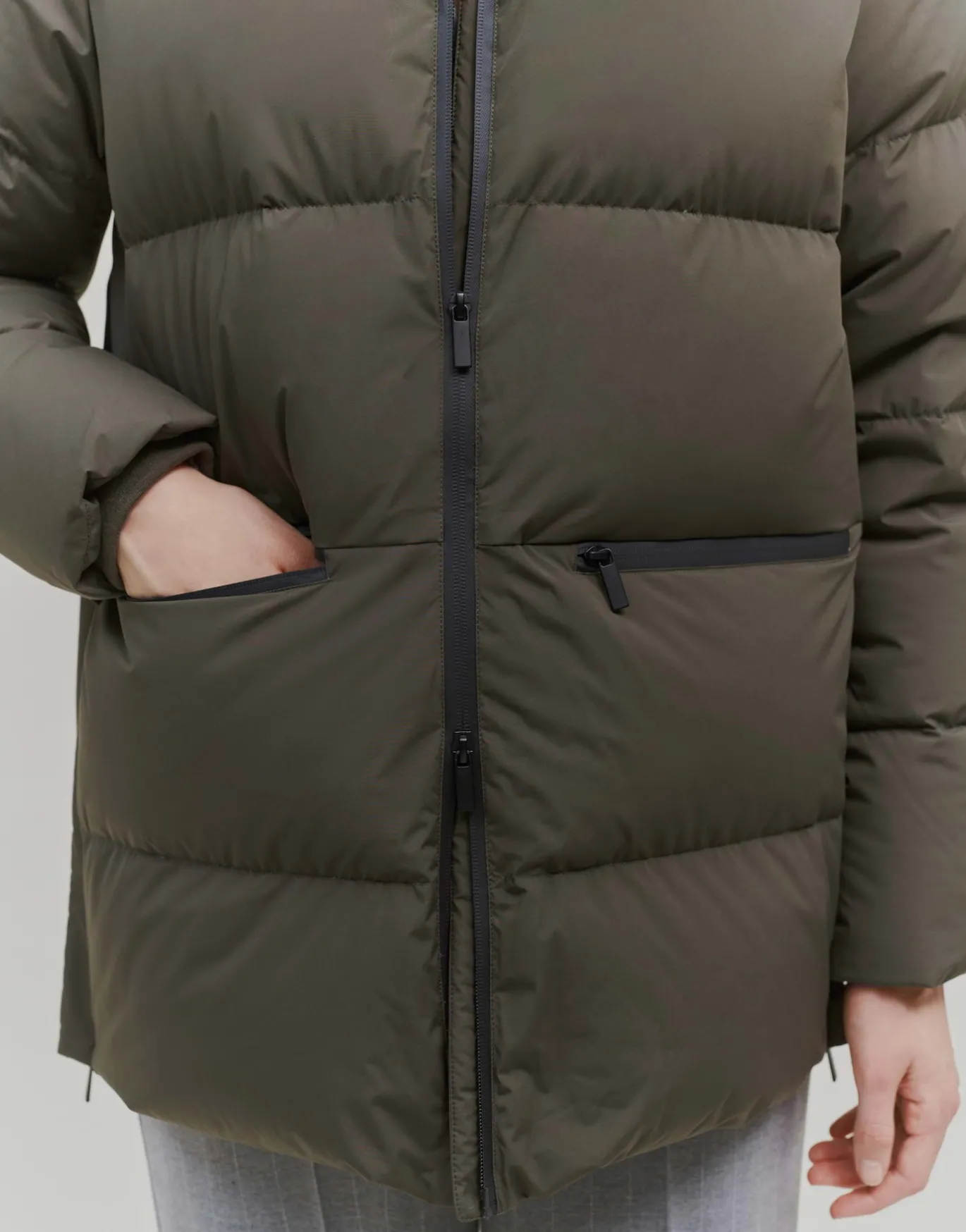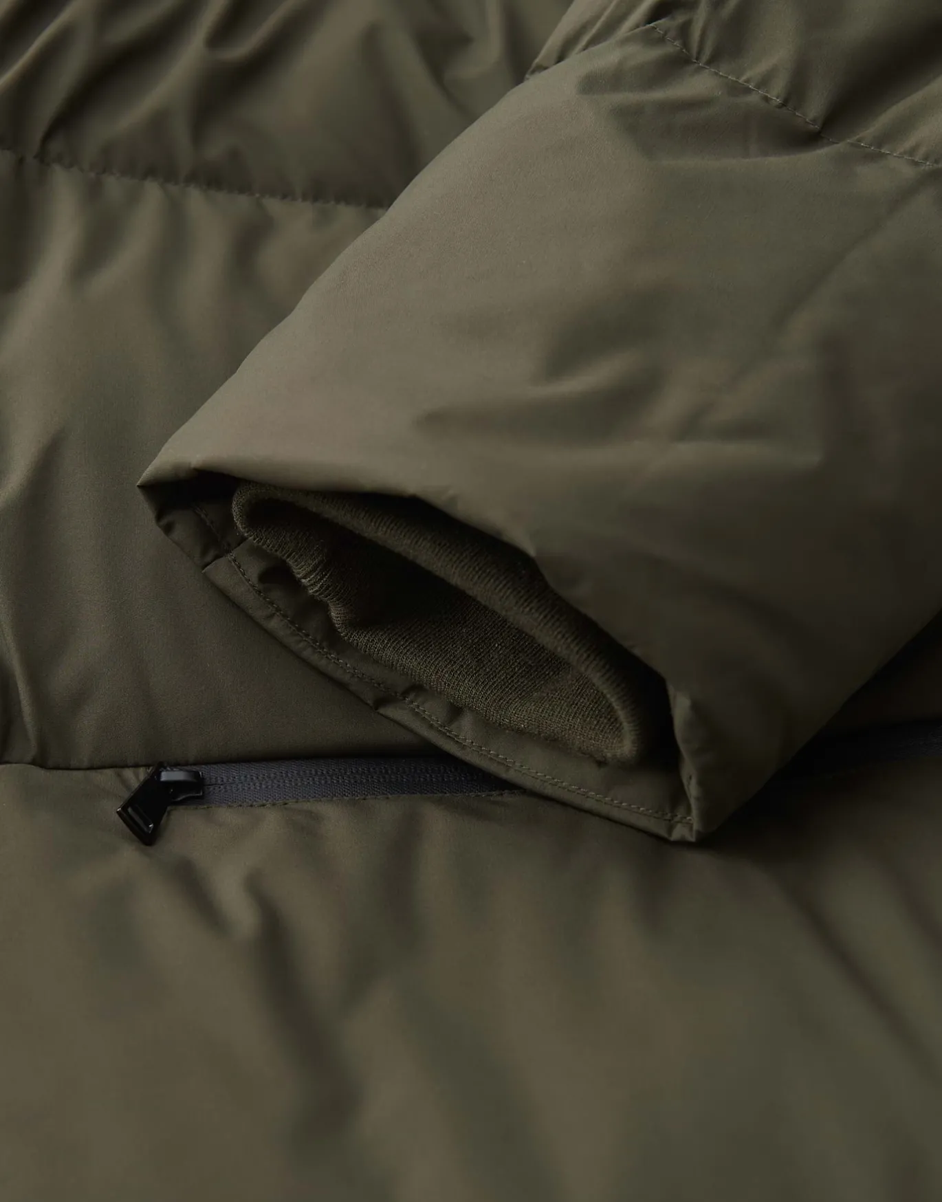Der Kurzmantel hält durch die voluminösen Kammern mit recycelten Daumen ultra warm und ist nebenbei wind- und wasserabweisend.