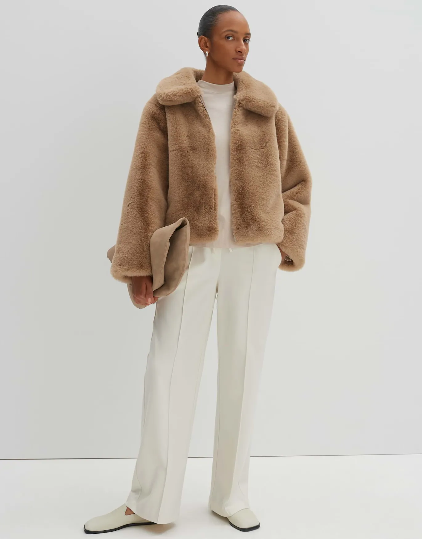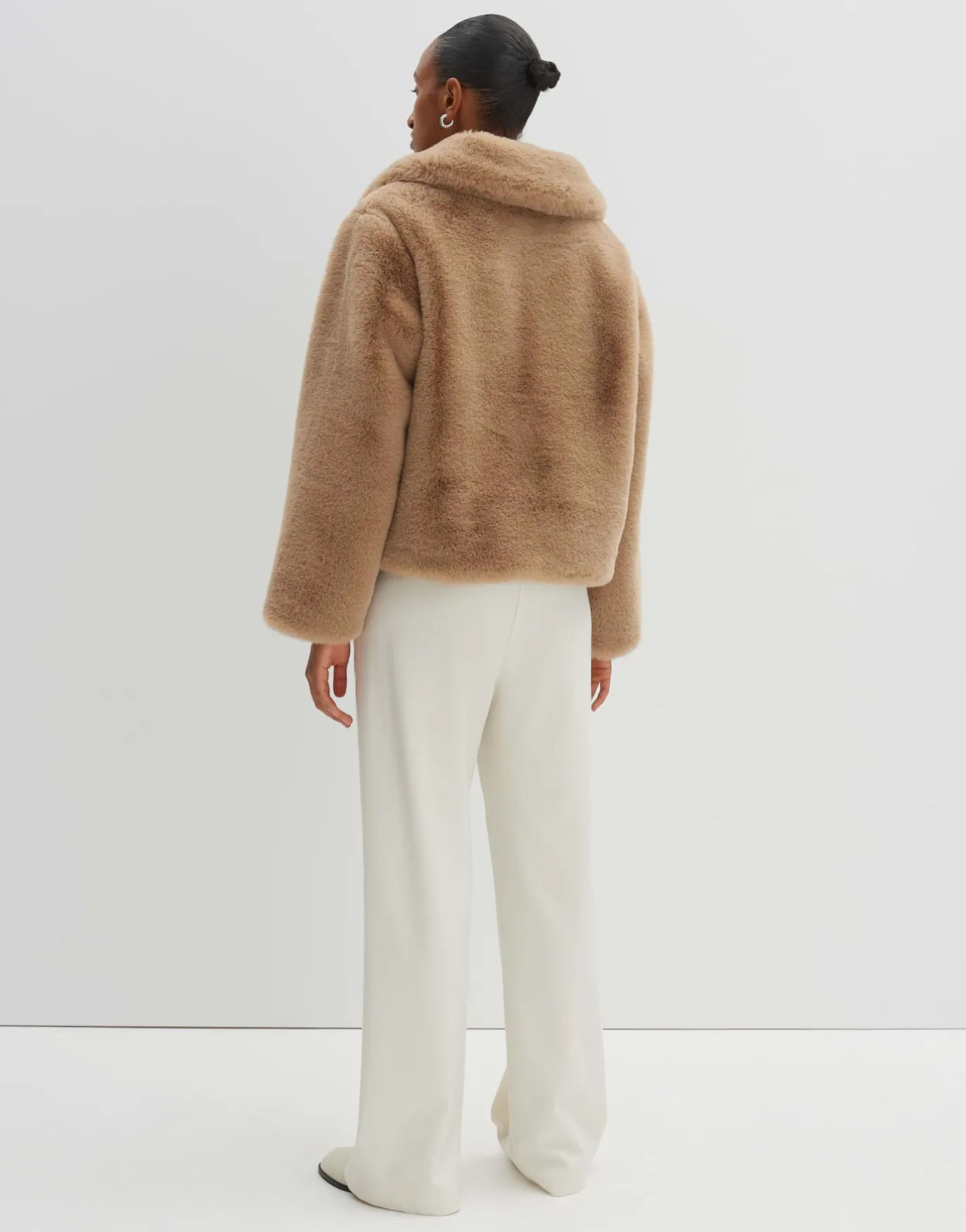 Die kurze und weite Jacke aus authentischem Fellimitat ist extrem weich, voluminös und hält angenehm warm.