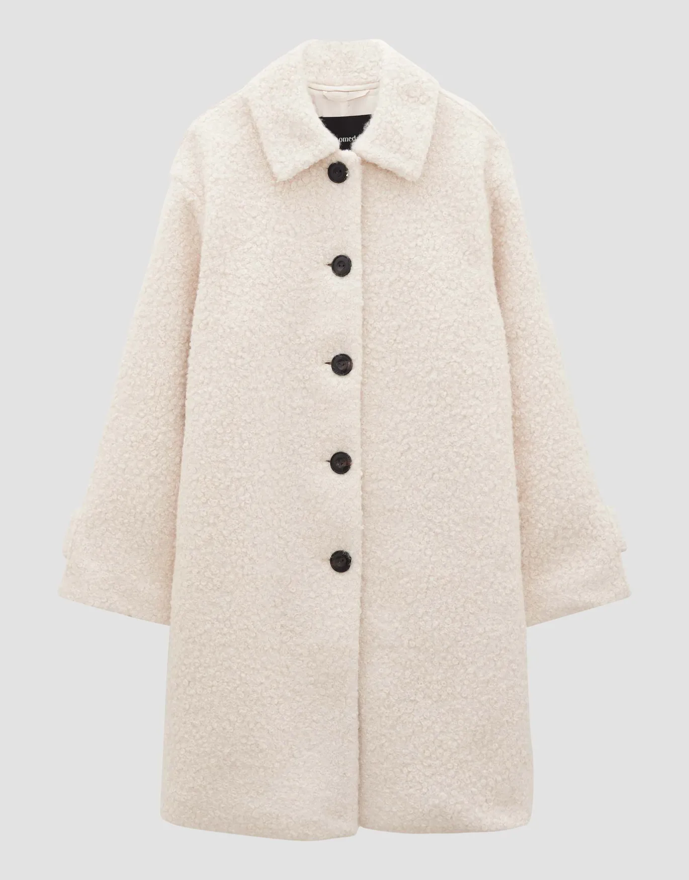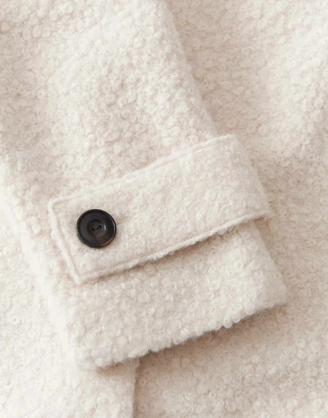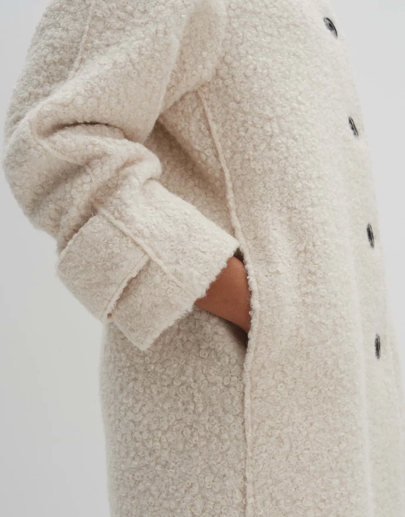 In diesem Mantel trifft zeitloses Design auf eine edel gelockte Woll Optik. Der mittellange, lockere Fit schmeichelt der Silhouette besonders.