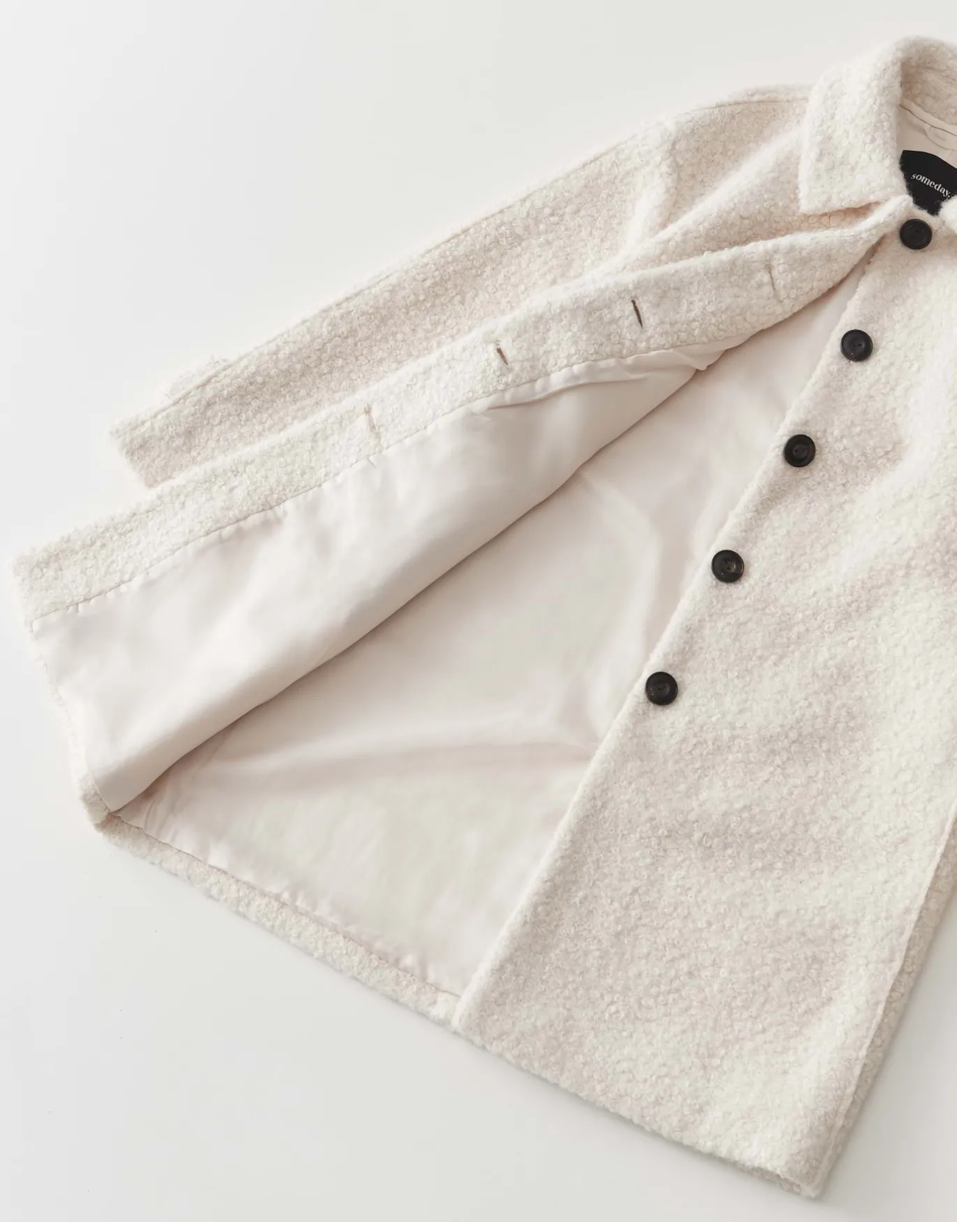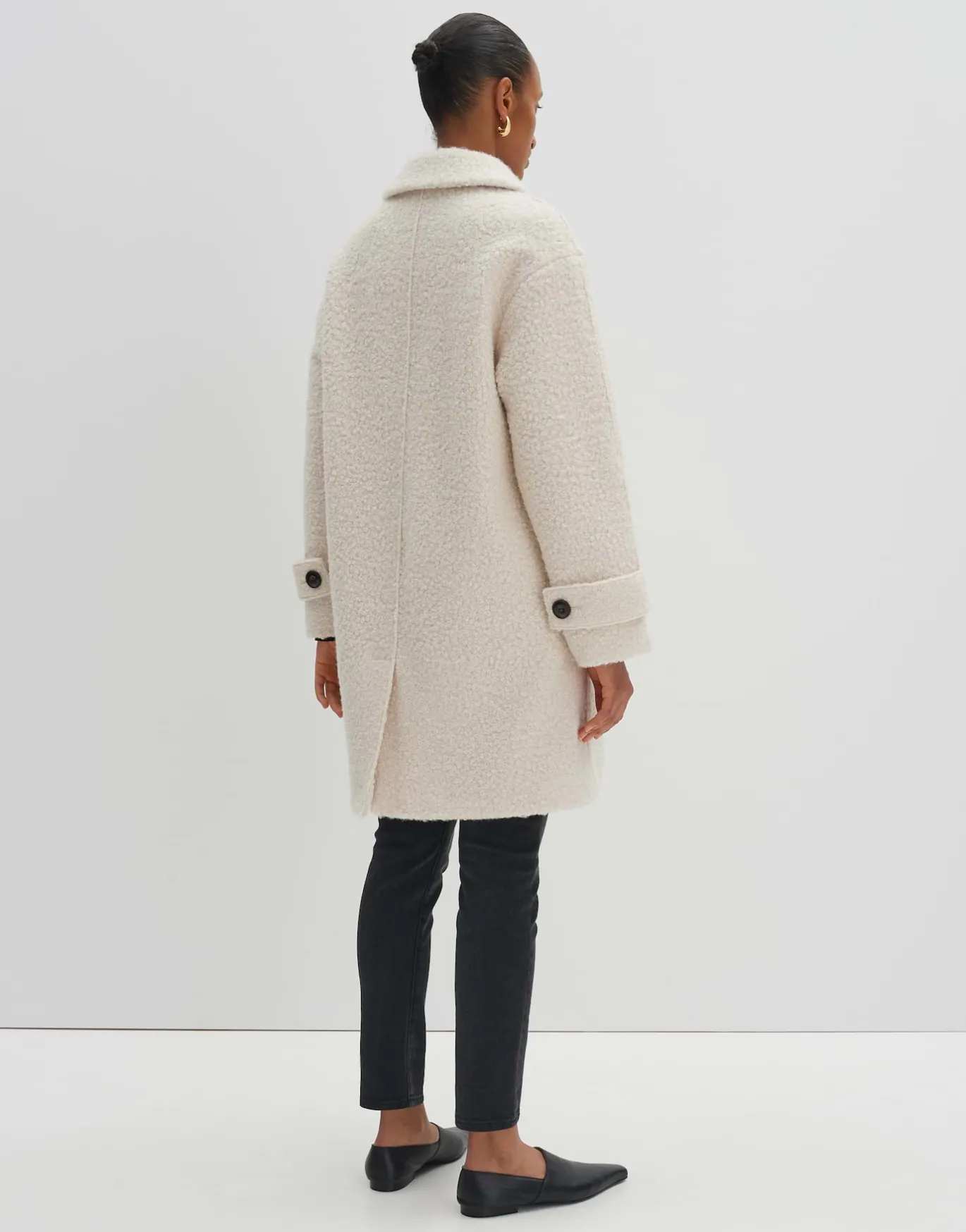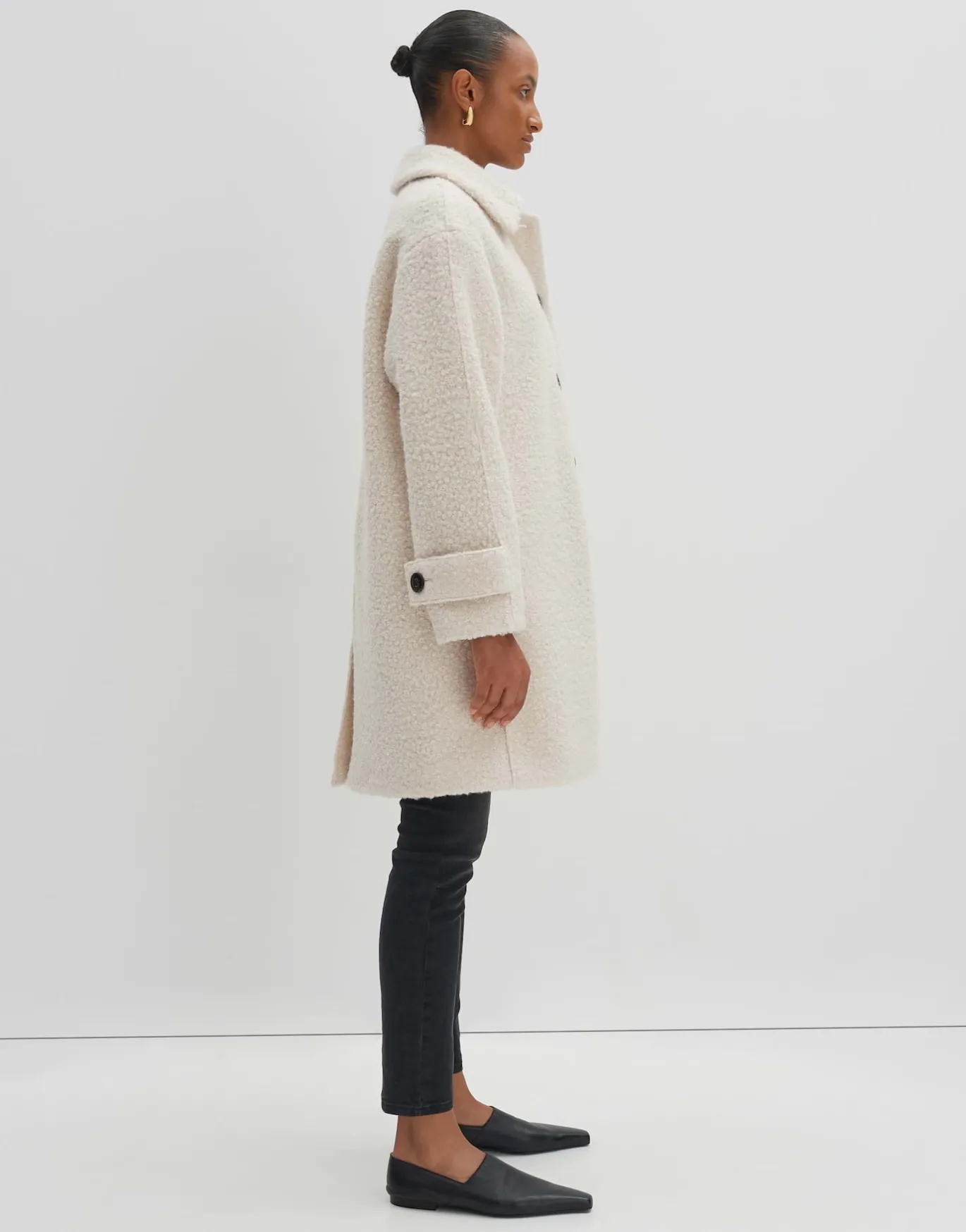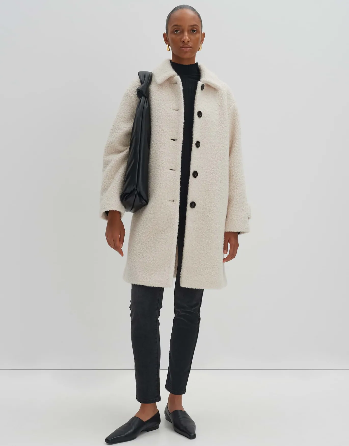 In diesem Mantel trifft zeitloses Design auf eine edel gelockte Woll Optik. Der mittellange, lockere Fit schmeichelt der Silhouette besonders.