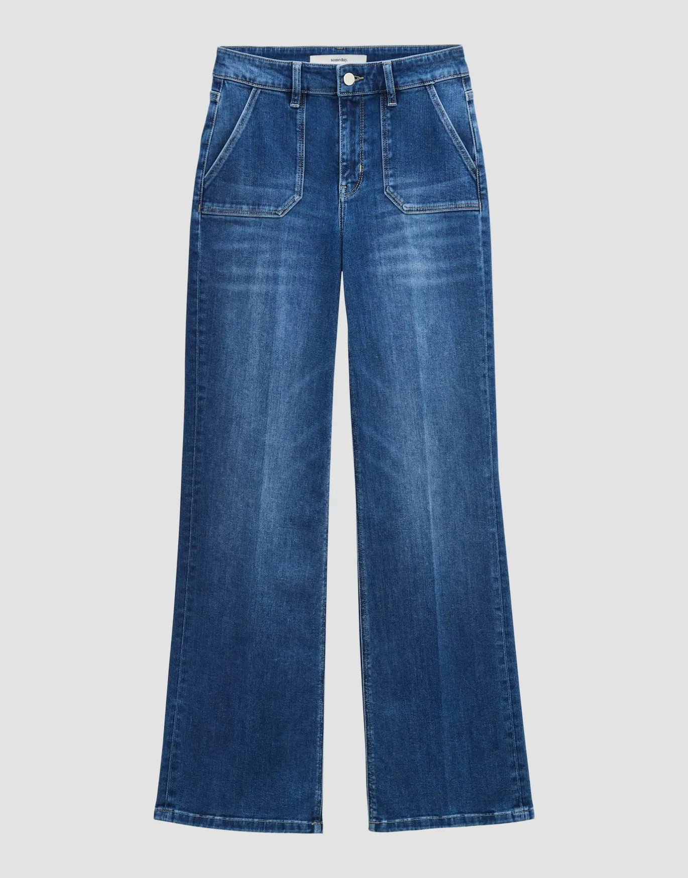 Die Flared Jeans überzeugt mit eckig abgesetzten Taschen im Utility Stil und setzt so einen coolen Akzent zum femininen Denim Look.