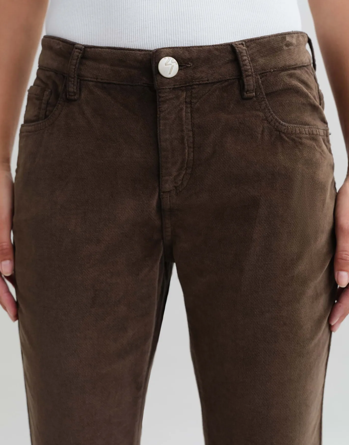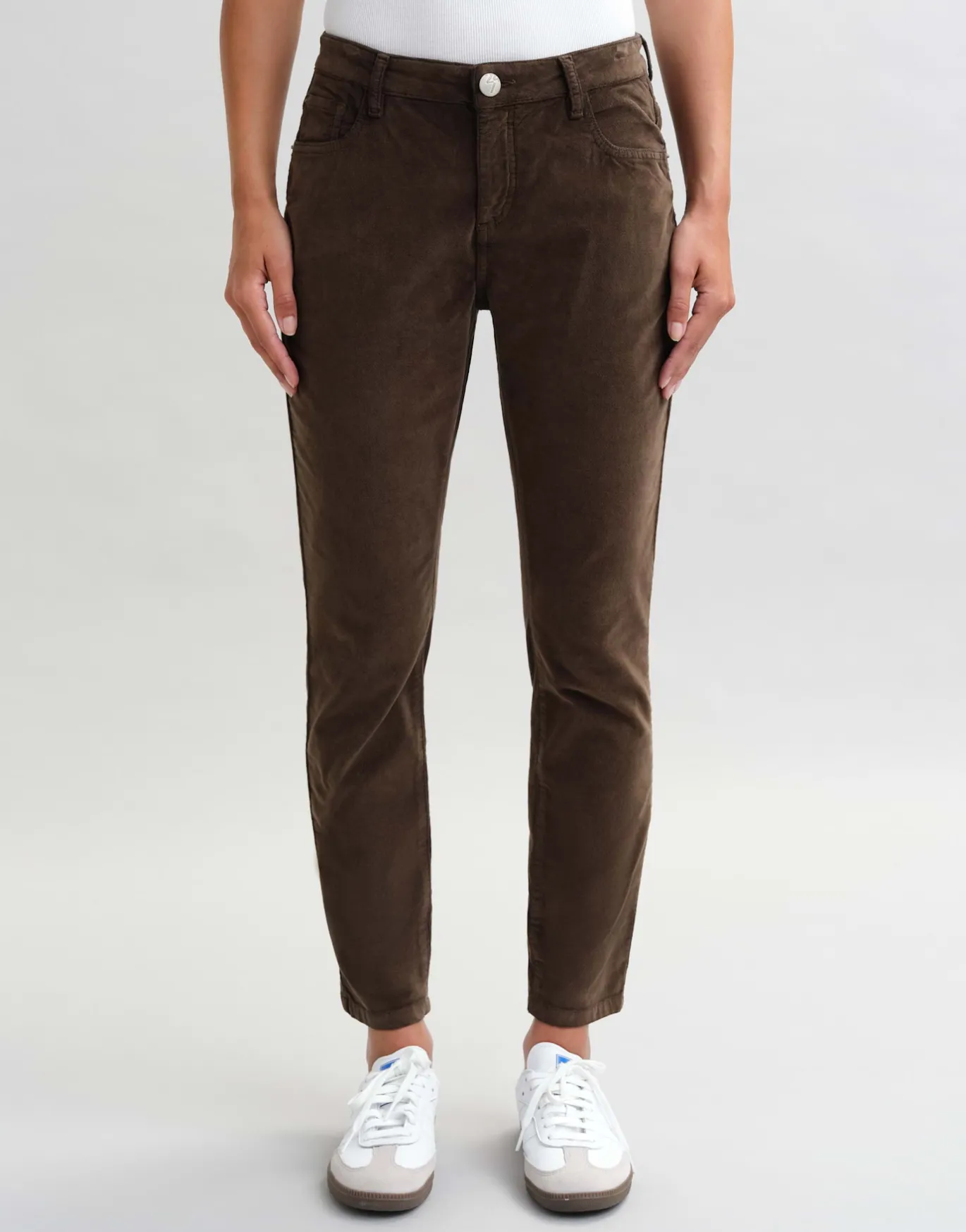 Die schmale Hose kommt durch die samtige Oberfläche mit einem extra weichem Tragekomfort daher und kreiert einen legeren Herbstlook.