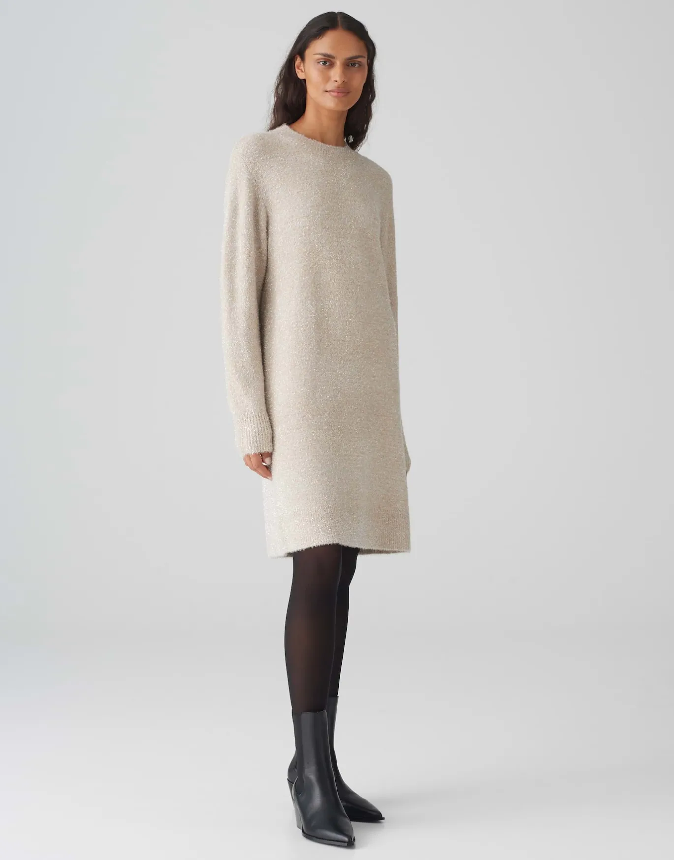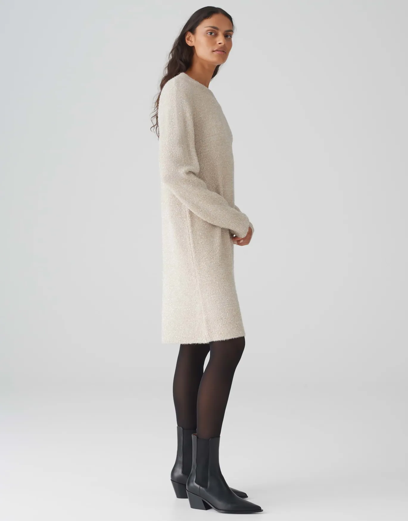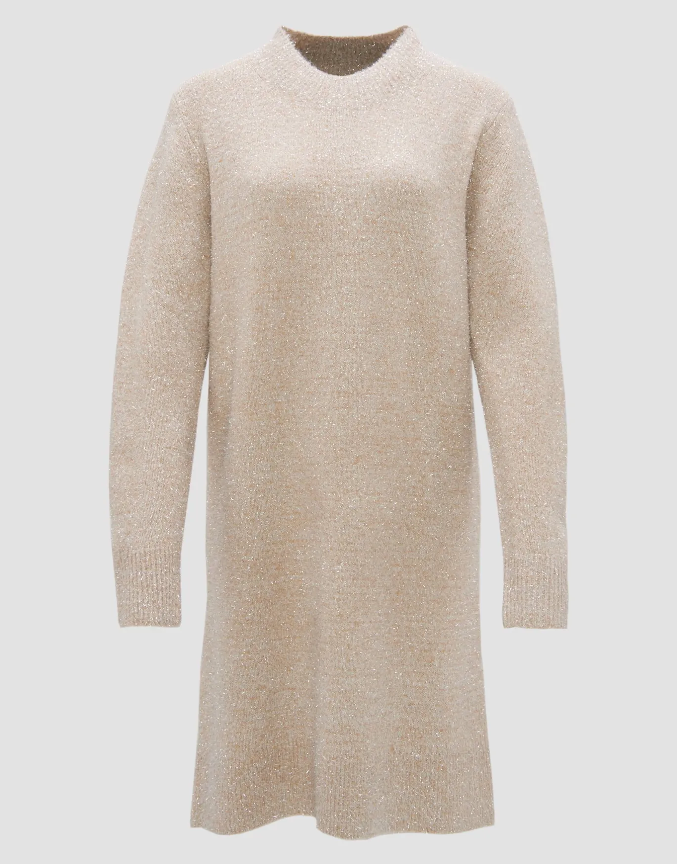 Dieses schimmernde Strickkleid ist der perfekte Allrounder für die kommende Saison und lässt sich sowohl modern mit schlichten Boots als auch elegant mit klassisch-hohen Schuhen stylen.