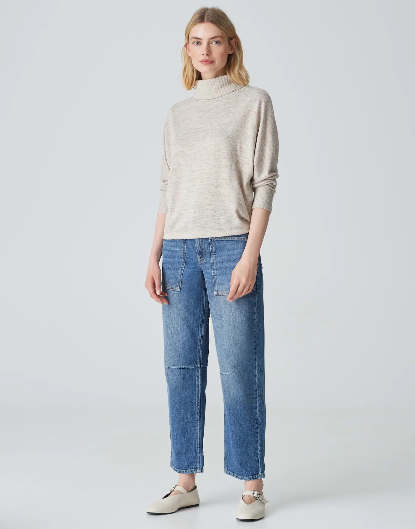 Das Rollkragenshirt im Batwing Stil spielt eine zarte Melange Optik auf einer gebürsteten Jerseyware und lässt sich perfekt in jeden Casual Look integrieren.