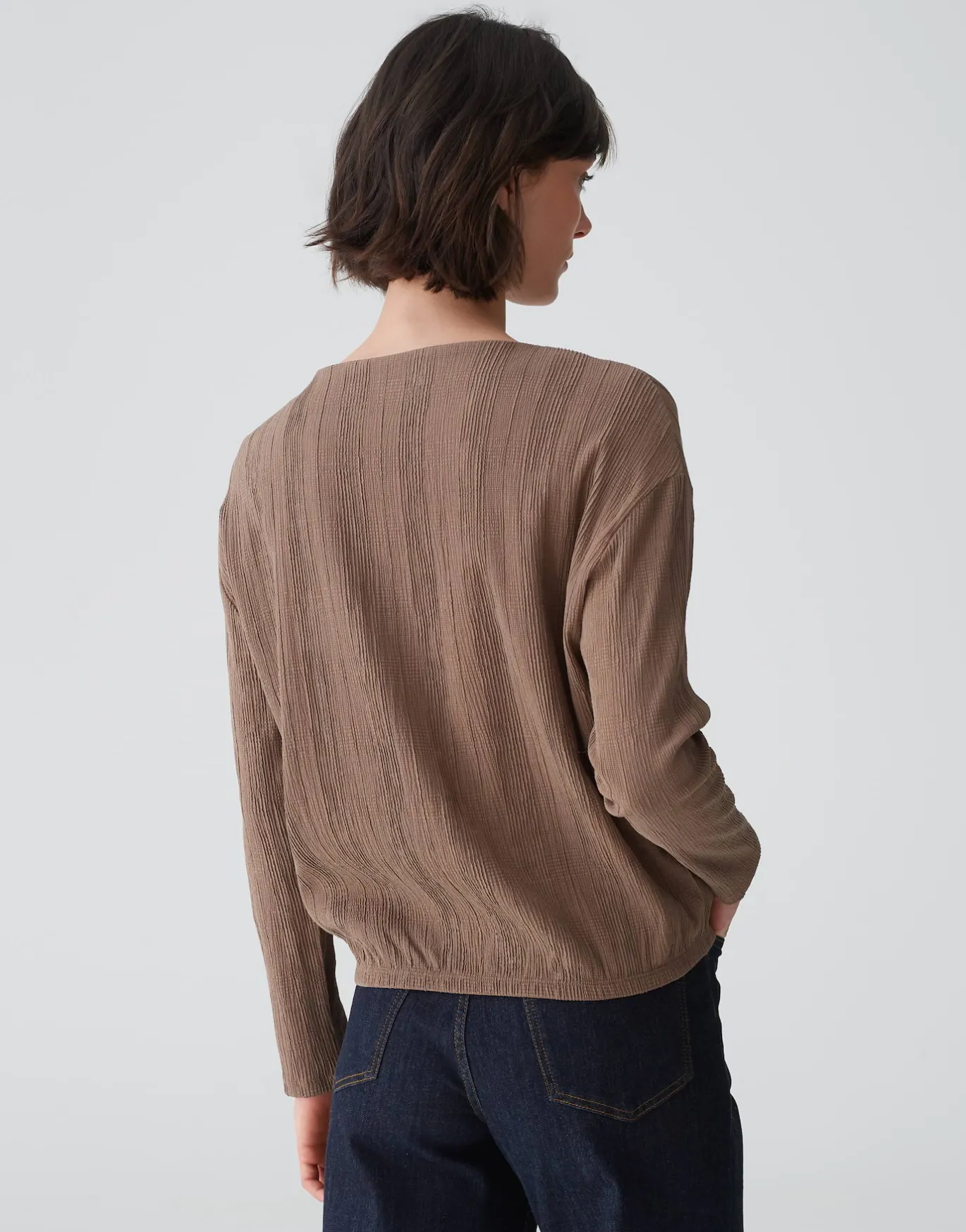 Das Langarmshirt begeistert mit der 3-dimensionalen Karostruktur und kann durch den schmalen Gummibund geschoppt getragen werden.