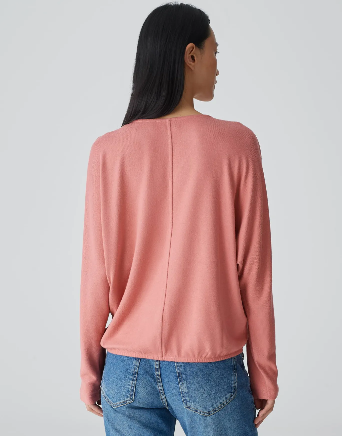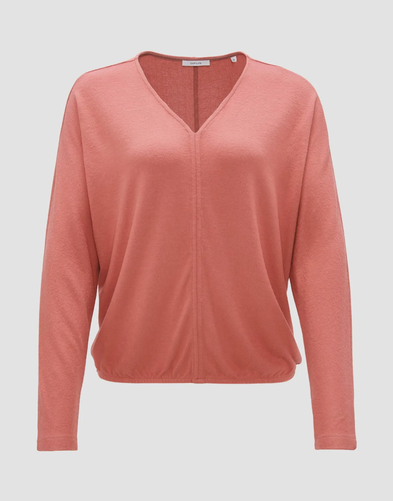 Das Jerseyshirt verfügt über eine weiche, gebürstete Oberfläche. Die lässige Passform wird durch den Fledermaus-Ärmel verstärkt und im Saum durch ein Gummibund schmal zusammen gezogen.