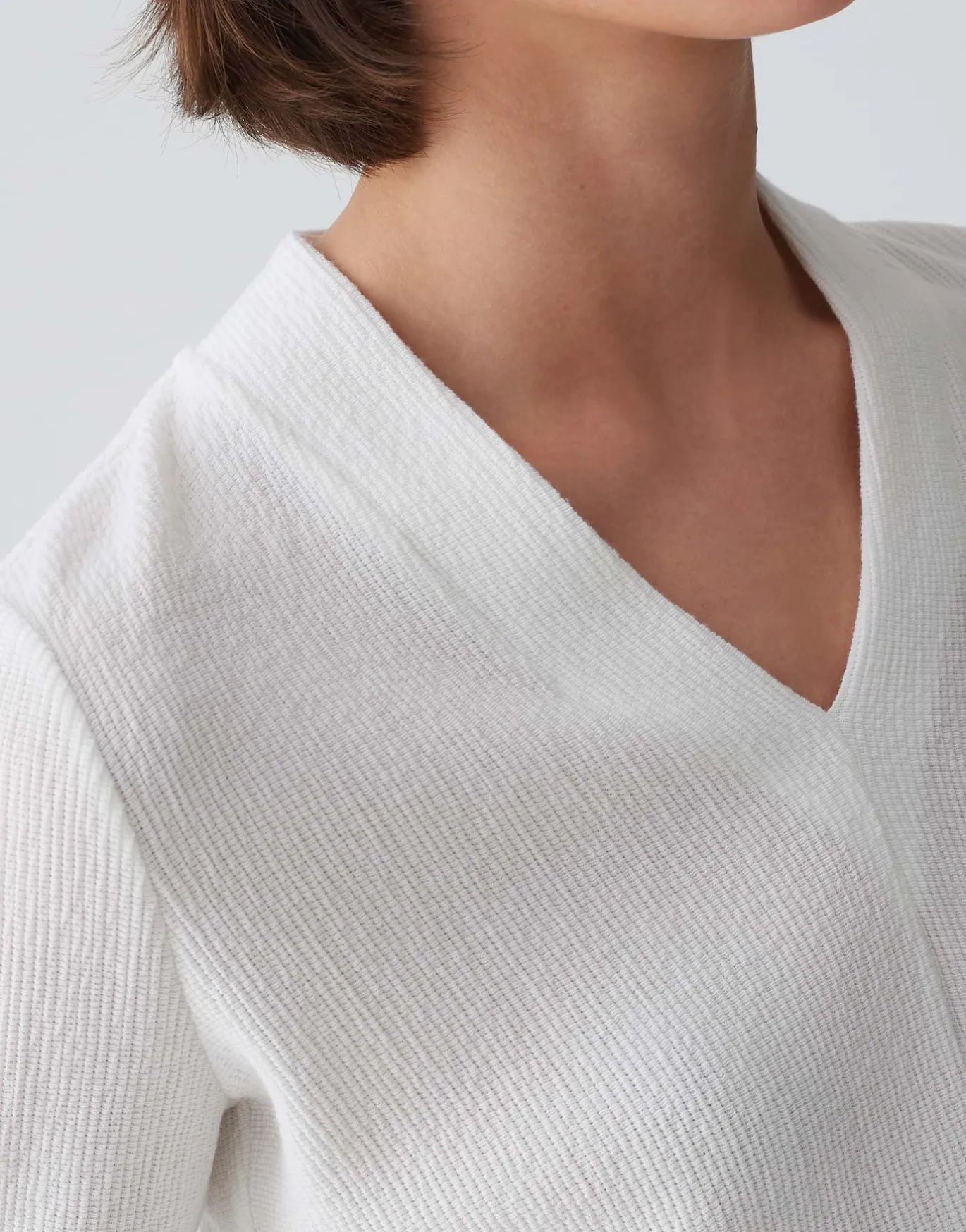 Das V-Shirt kann als Unterzieher aber auch allein für sich getragen werden und bringt durch die strukturierte Oberfläche schöne Akzente in die Looks.