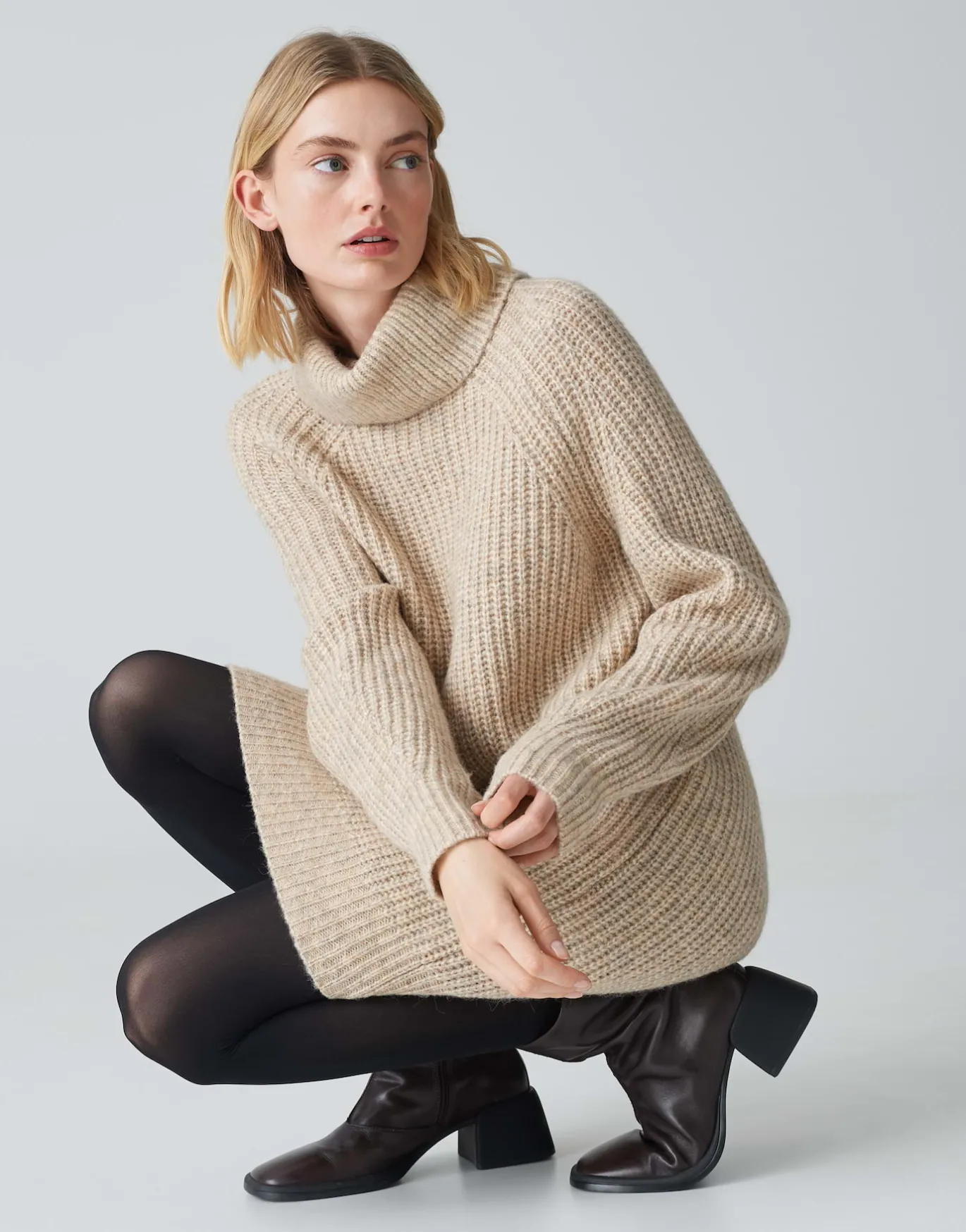 Das kuschelige Strickkleid besitzt einen voluminösen Rollkragen, welcher an kalten Tagen den Hals besonders angenehm wärmt. Die grobe Rippstruktur und der Oversize Look runden das Kleid optimal ab – für einen femininen Cosy Look.