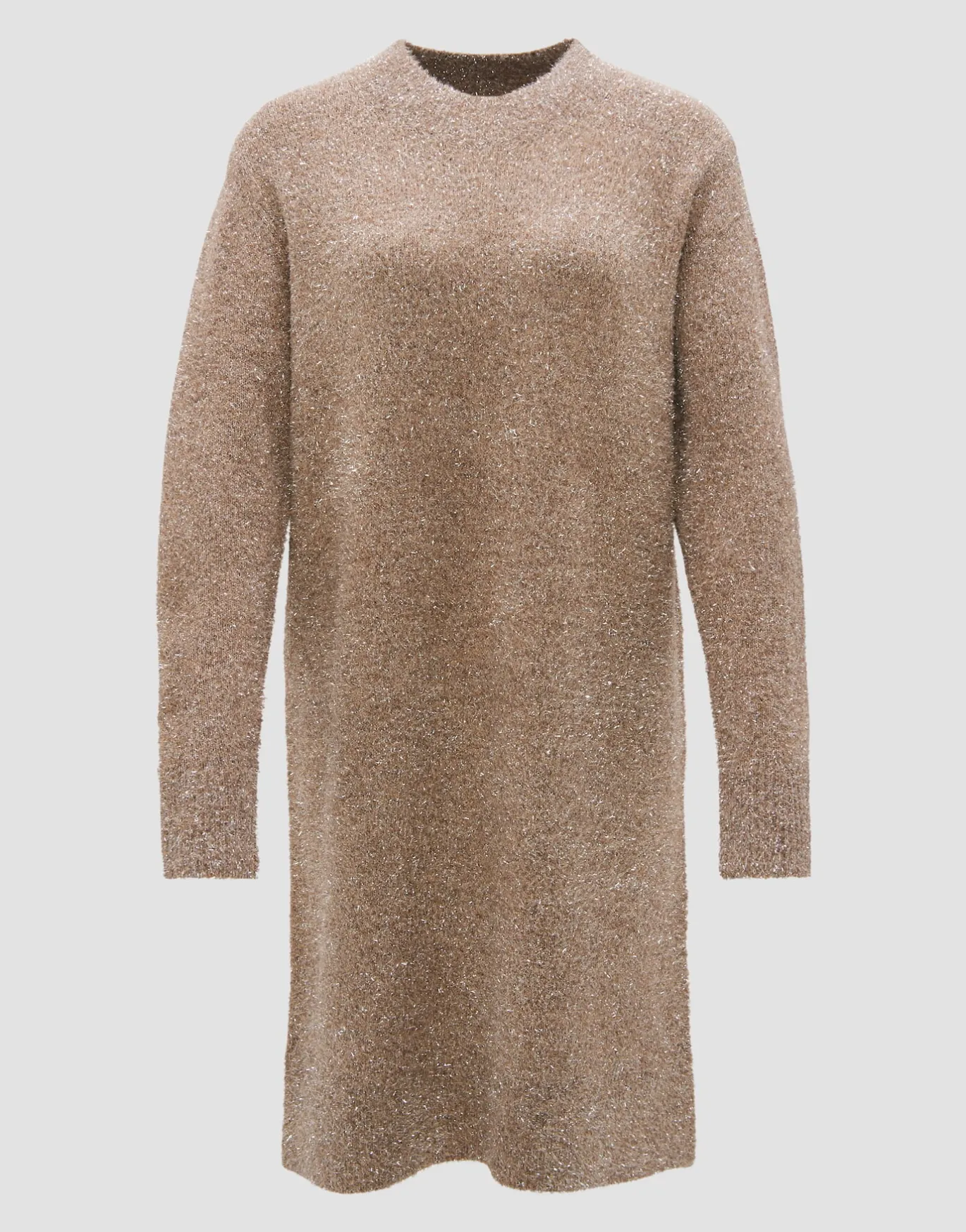 Dieses schimmernde Strickkleid ist der perfekte Allrounder für die kommende Saison und lässt sich sowohl modern mit schlichten Boots als auch elegant mit klassisch-hohen Schuhen stylen.