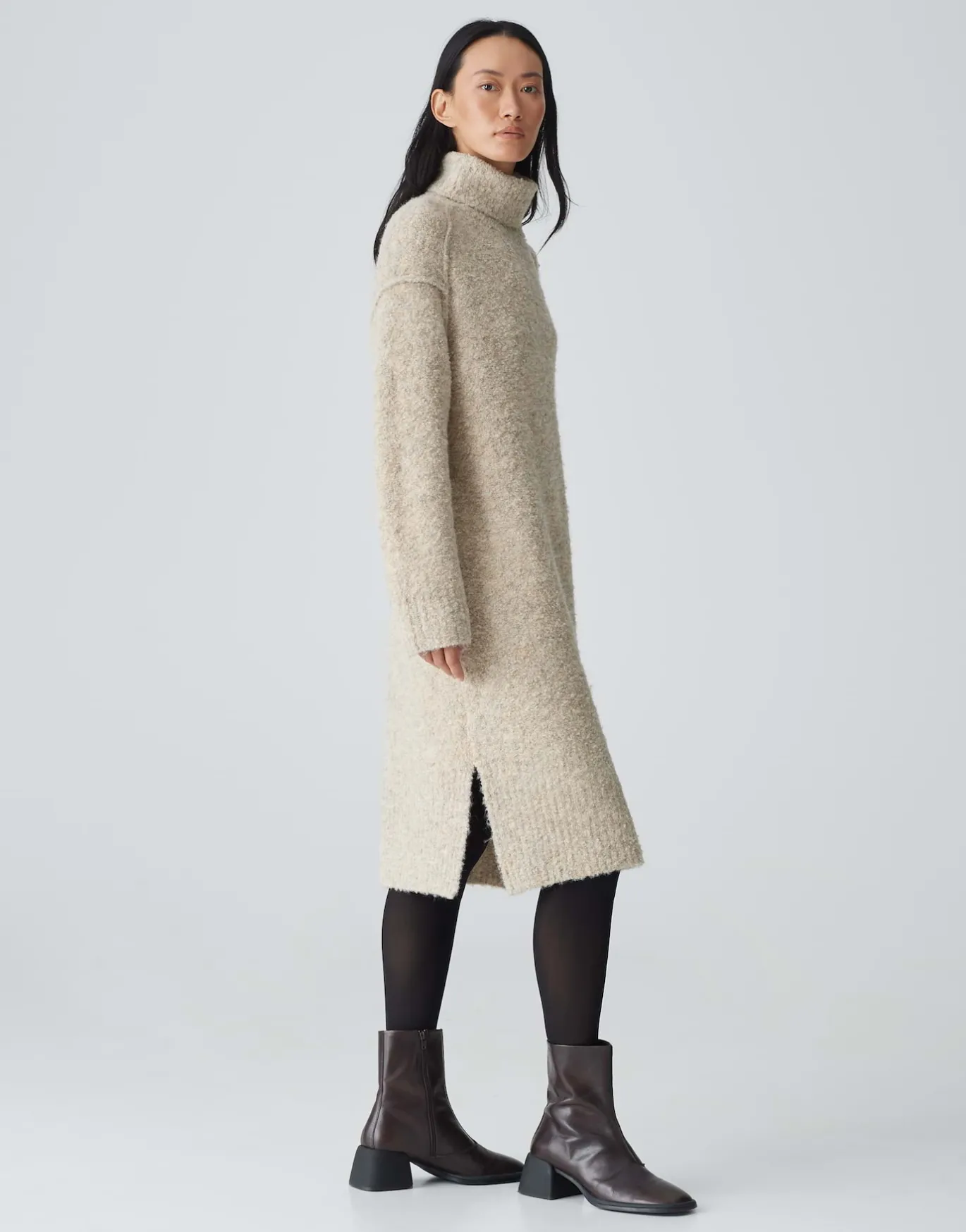 Weicher Strick ist unverzichtbar in der kühlen Jahreszeit. Das knieumspielende Midikleid hält nicht nur warm, sondern überzeugt auch mit seinem Layering-Potenzial.