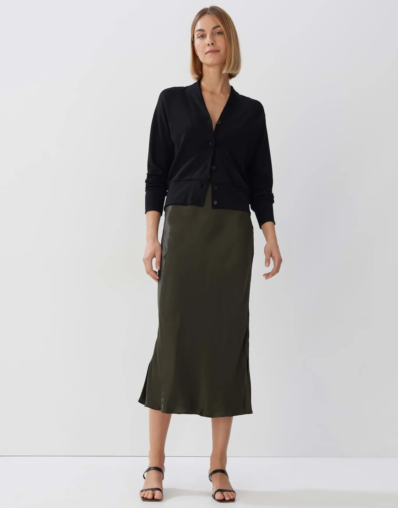 Die Sweatjacke überzeugt mit der Funktionalität und Form einer Strickjacke gespielt über super weichen Jersey.