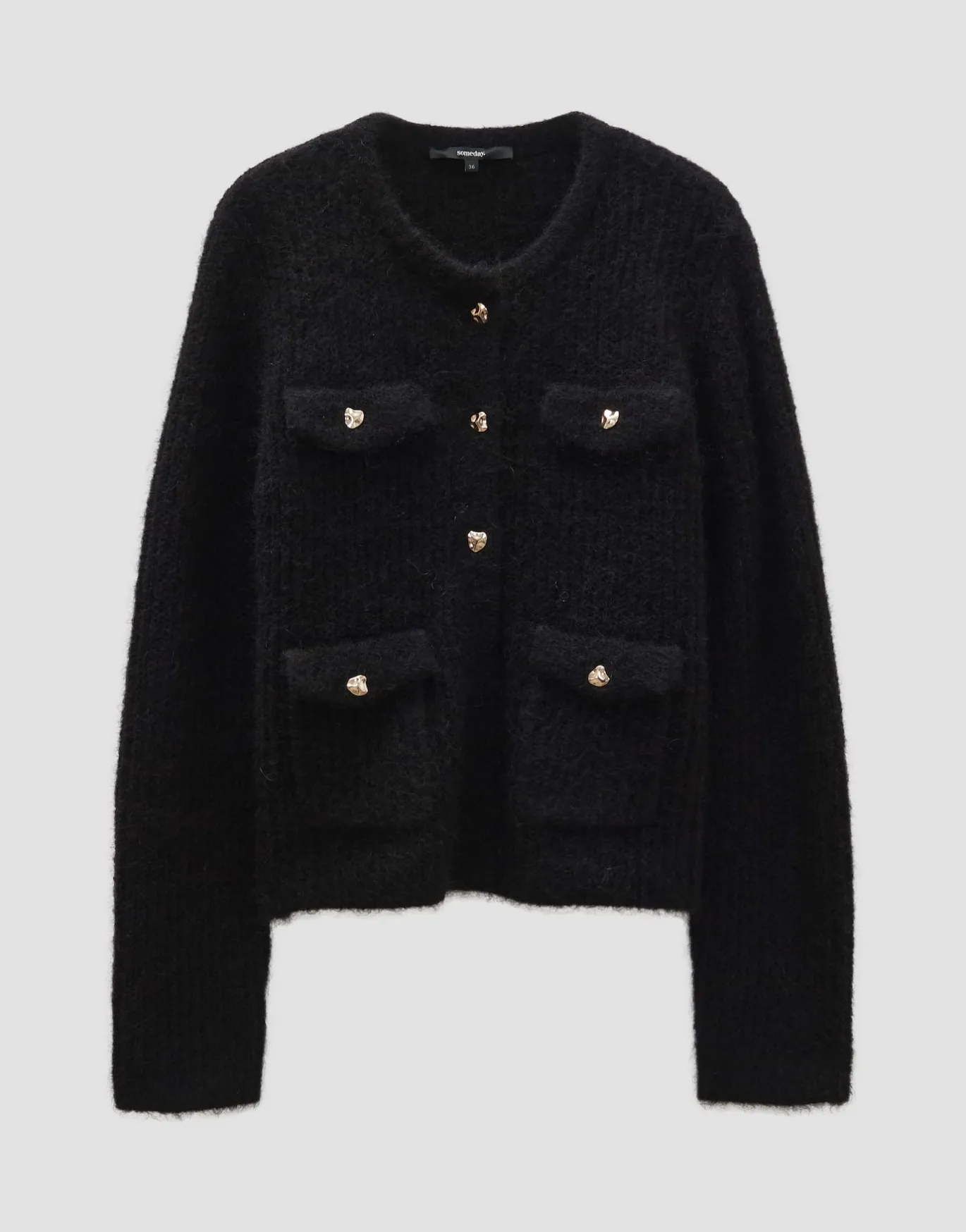 Der Cardigan erhält durch den Mohair Anteil eine extrem flauschige Oberfläche und setzt auf luxuriöse Metall-Knöpfe, die wunderschön schimmern.