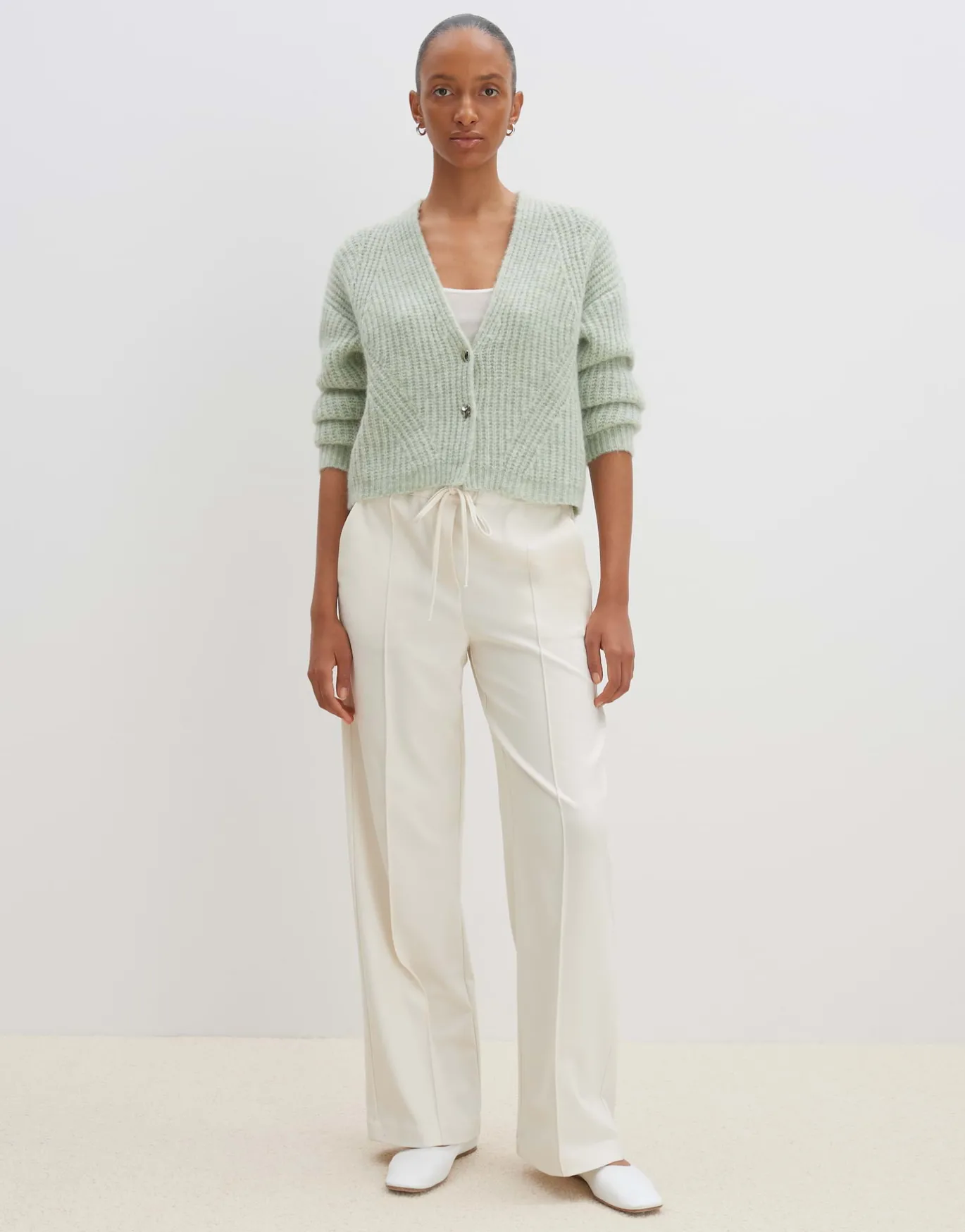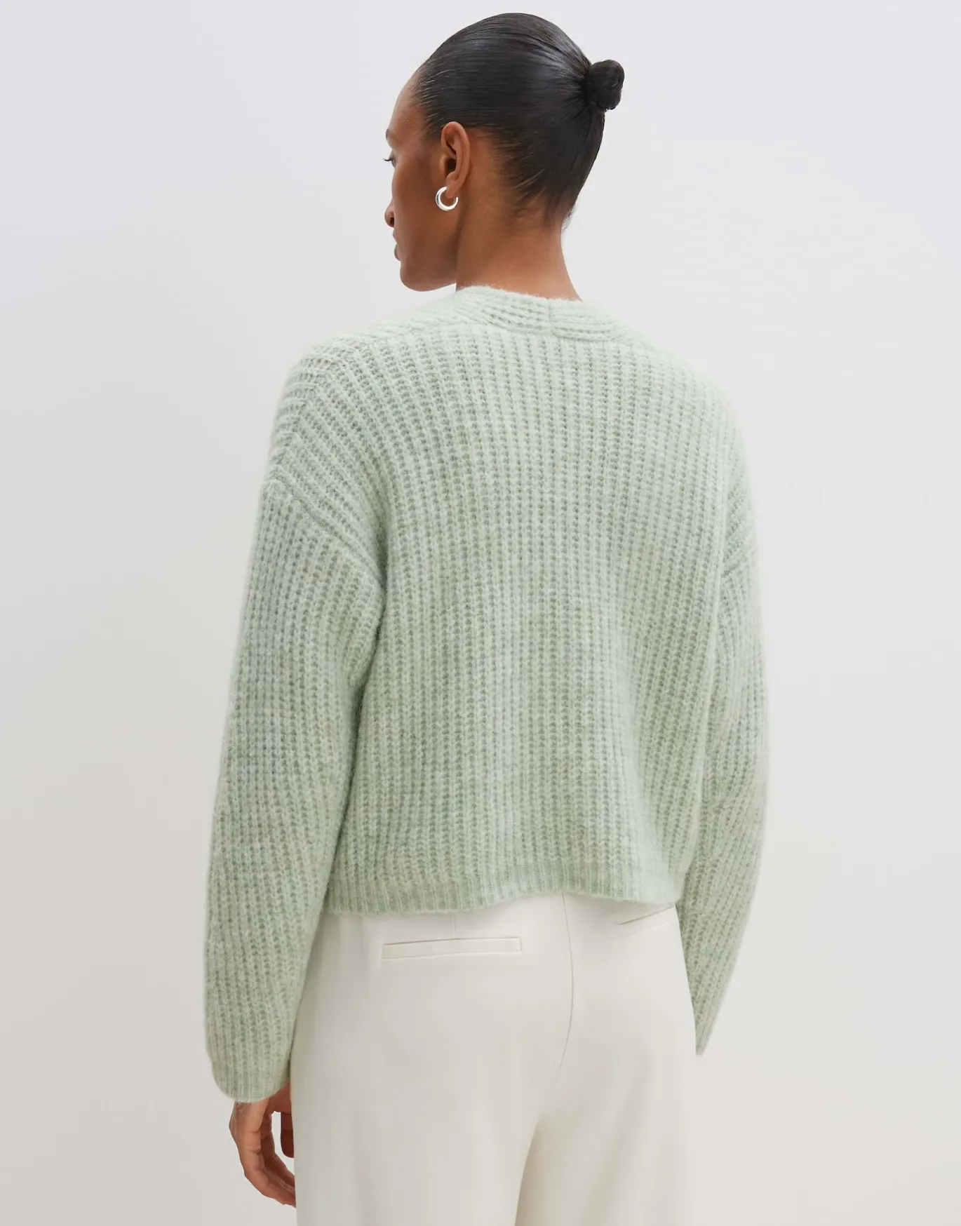 Die Strickjacke setzt auf metallisch glänzende Knöpfe in organischer Form, die einen spannenden Kontrast zur natürlichen Anmutung des Cardigans setzen.