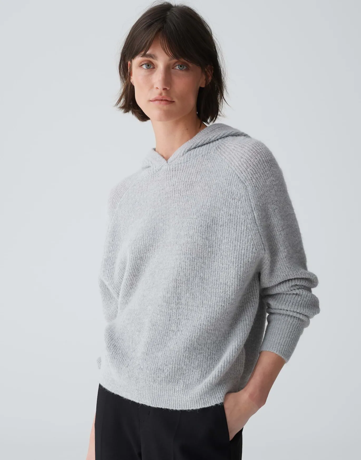 Der Strickpullover aus flauschigem Alpaka-Woll-Mix verleiht durch die elastische Rippstruktur und der sportiven Kapuze jedem Look einen lässigen Twist.