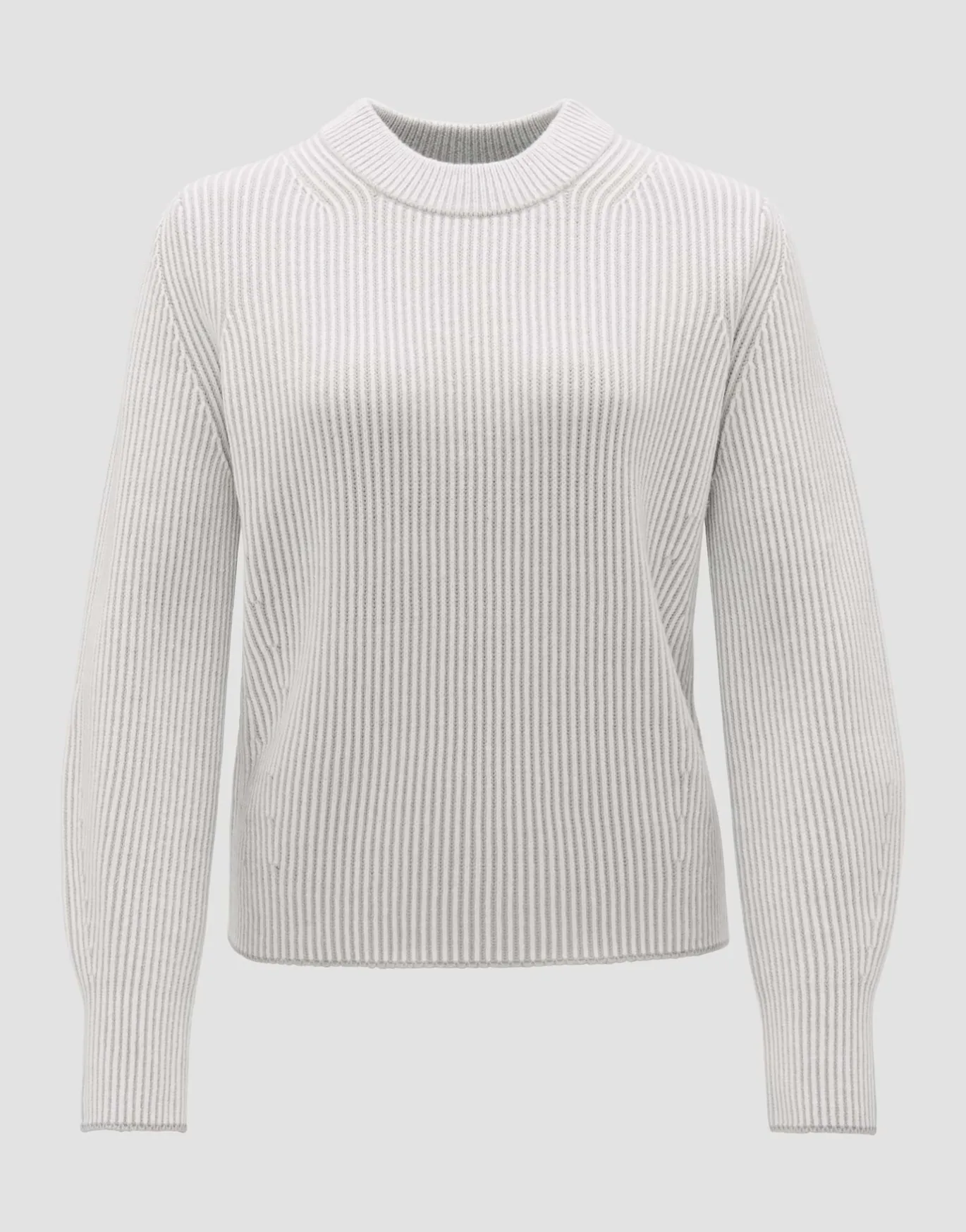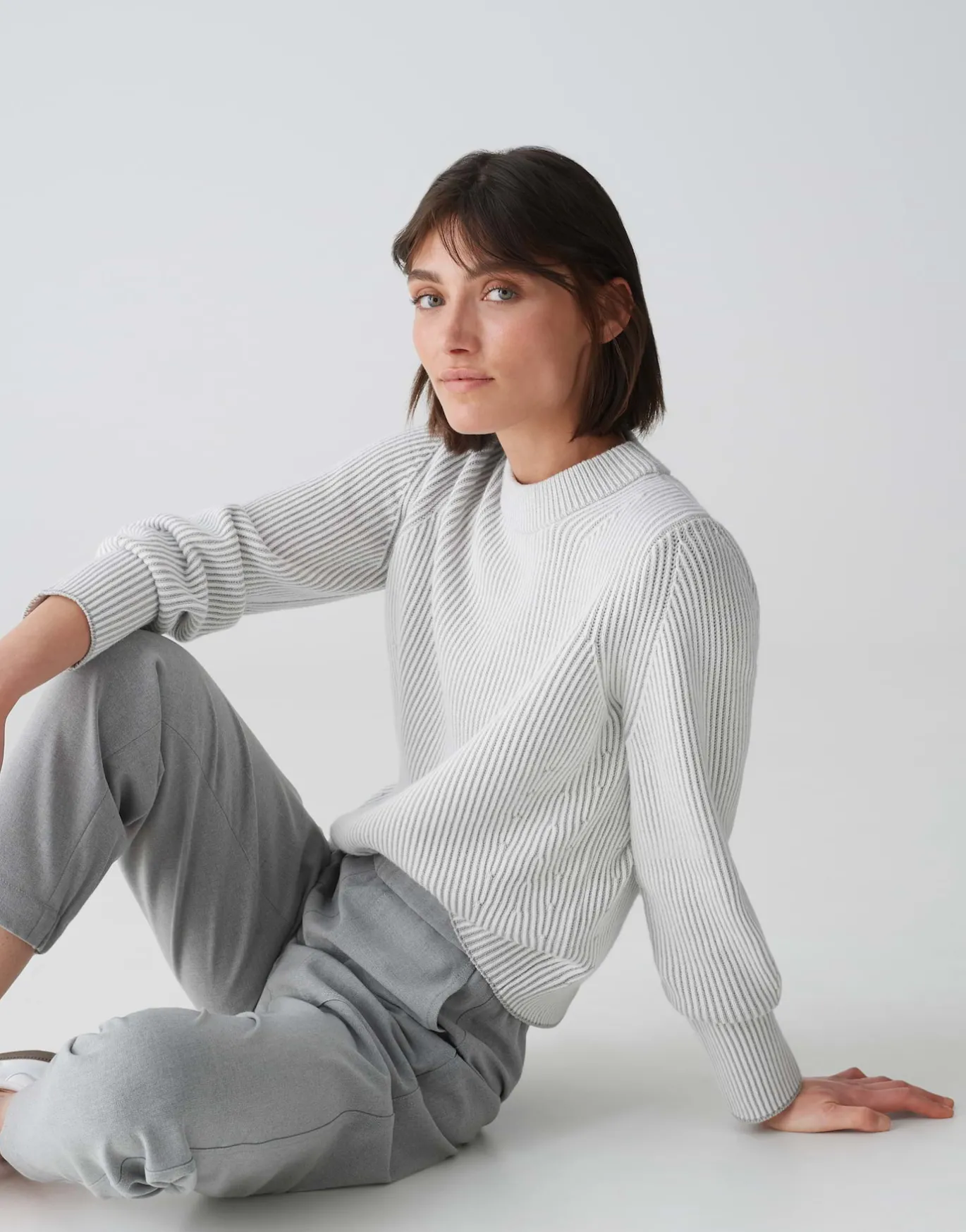 Der Strickpullover verfügt durch die zweifarbige Rippstruktur eine spannende Oberfläche und bringt schöne Akzente in die Looks.